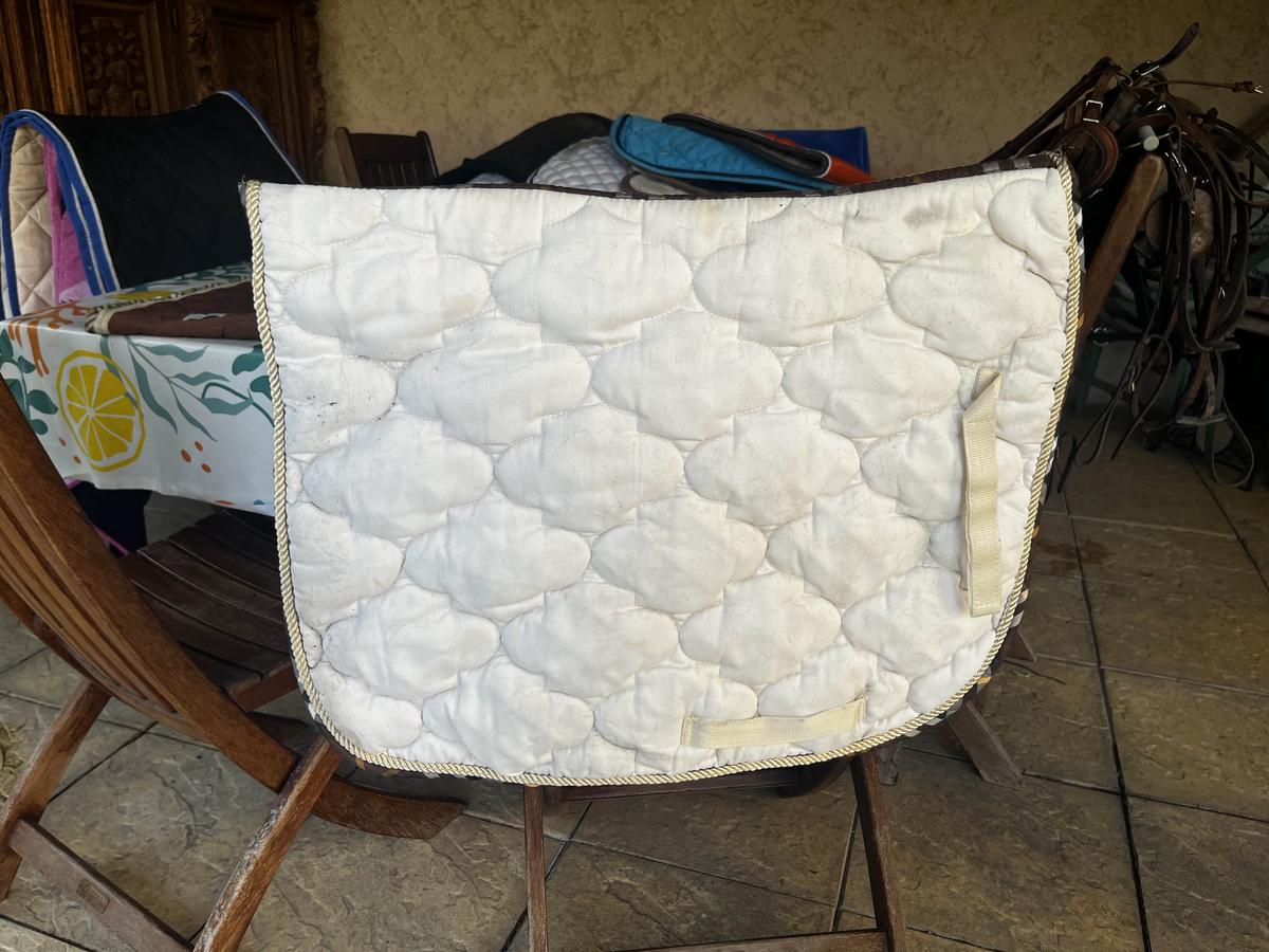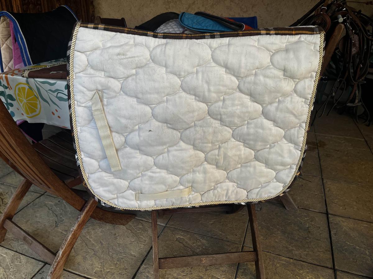 vends tapis dressage sans marque, porte 10 fois en concours. il est blanc cassé avec les bords à carreaux marron, il a un très beau rendu porté.