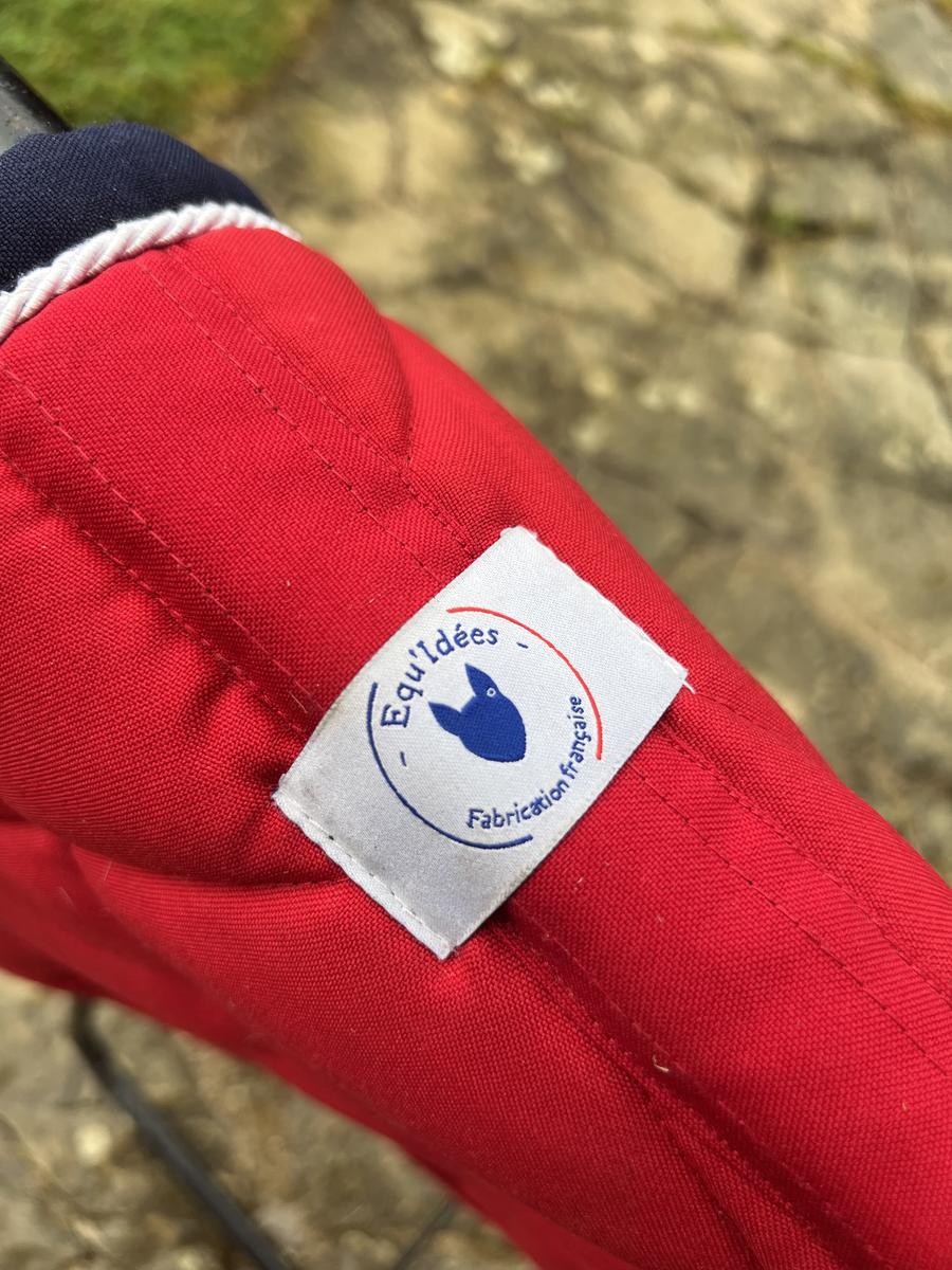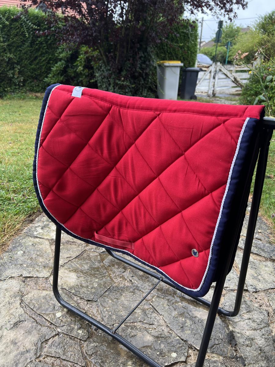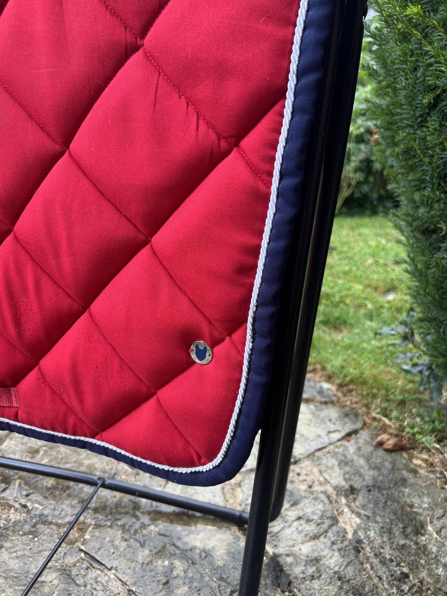 Joli tapis rouge avec un bord marine et un galon tressé blanc. Tapis en parfait état ne montrant aucun signe d’usure. Il a été porté une dizaine de fois. Nid d’abeille non usé.