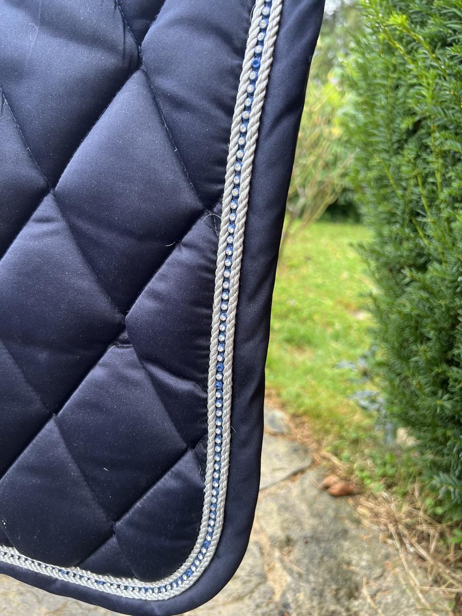 Tapis bleu marine équitheme. Il a été porté une 20e de fois. En très bon état, le dessus en matière un peu satiné et il a un joli liseré pailleté. Comme on peut le voir sur les photos, il manque quelques petits strass cependant cela reste invisible porté.