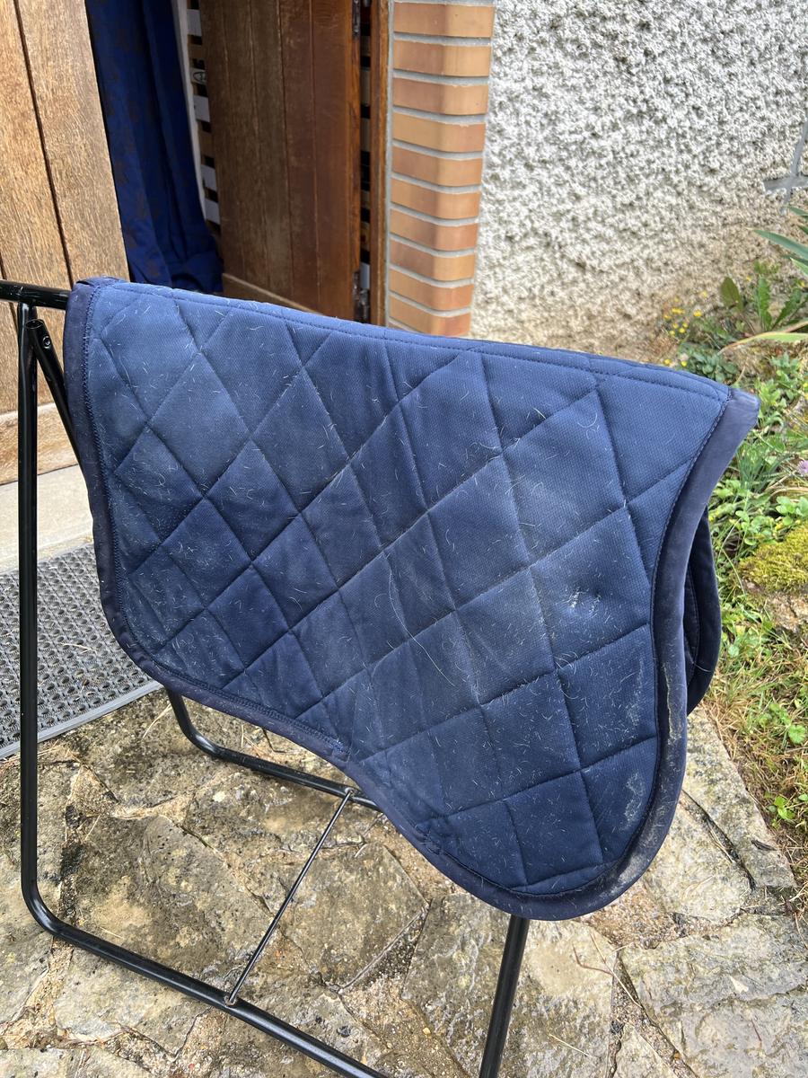 Tapis bleu marine équitheme. Il a été porté une 20e de fois. En très bon état, le dessus en matière un peu satiné et il a un joli liseré pailleté. Comme on peut le voir sur les photos, il manque quelques petits strass cependant cela reste invisible porté.