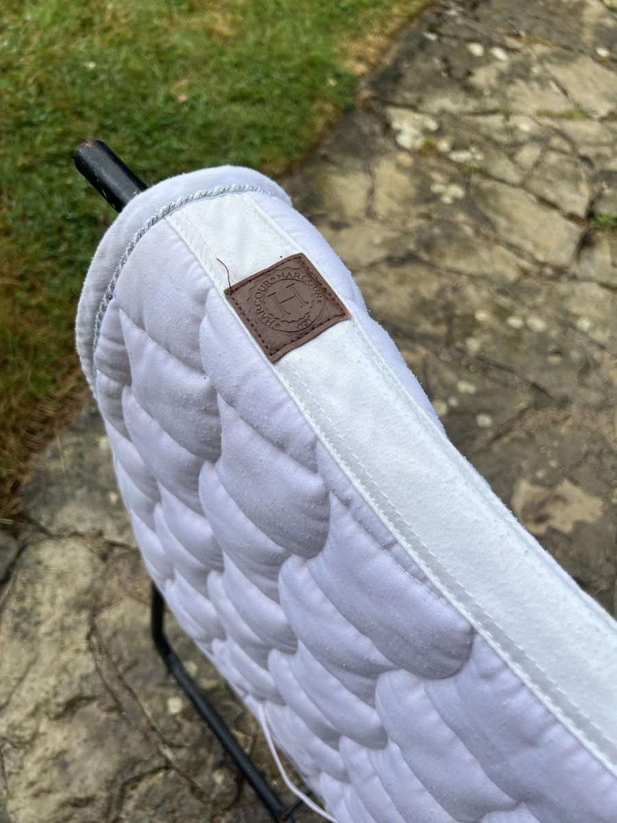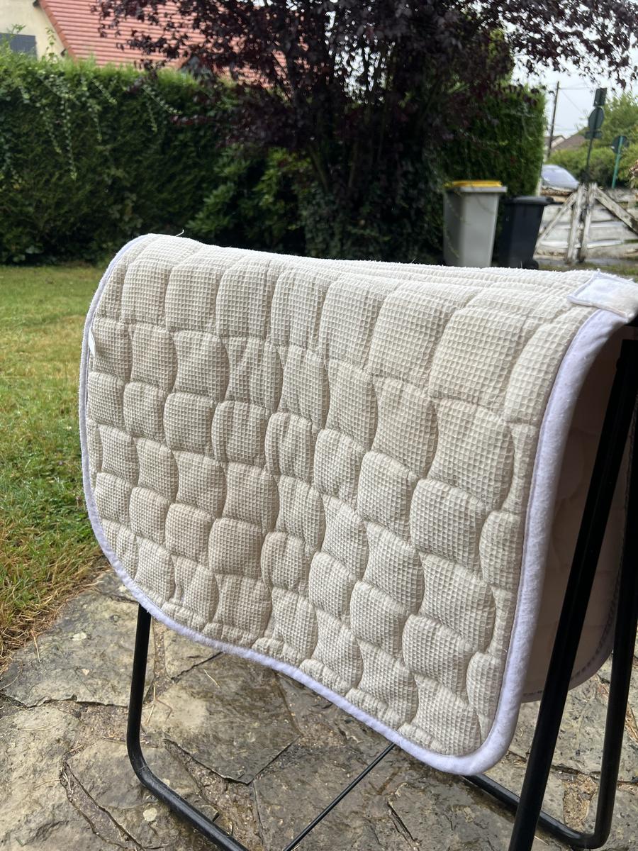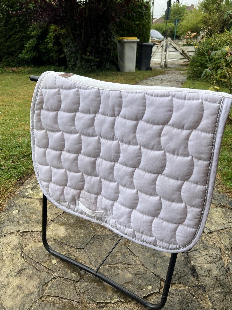 Tapis blanc Harcour avec un liseré argenté. Le tapis à été pas mal utilisé d’où les petites bouloches visibles sur les photos. Cependant, il n’est pas taché et l’intérieur est très propre. Il peut encore tout à fait servir.