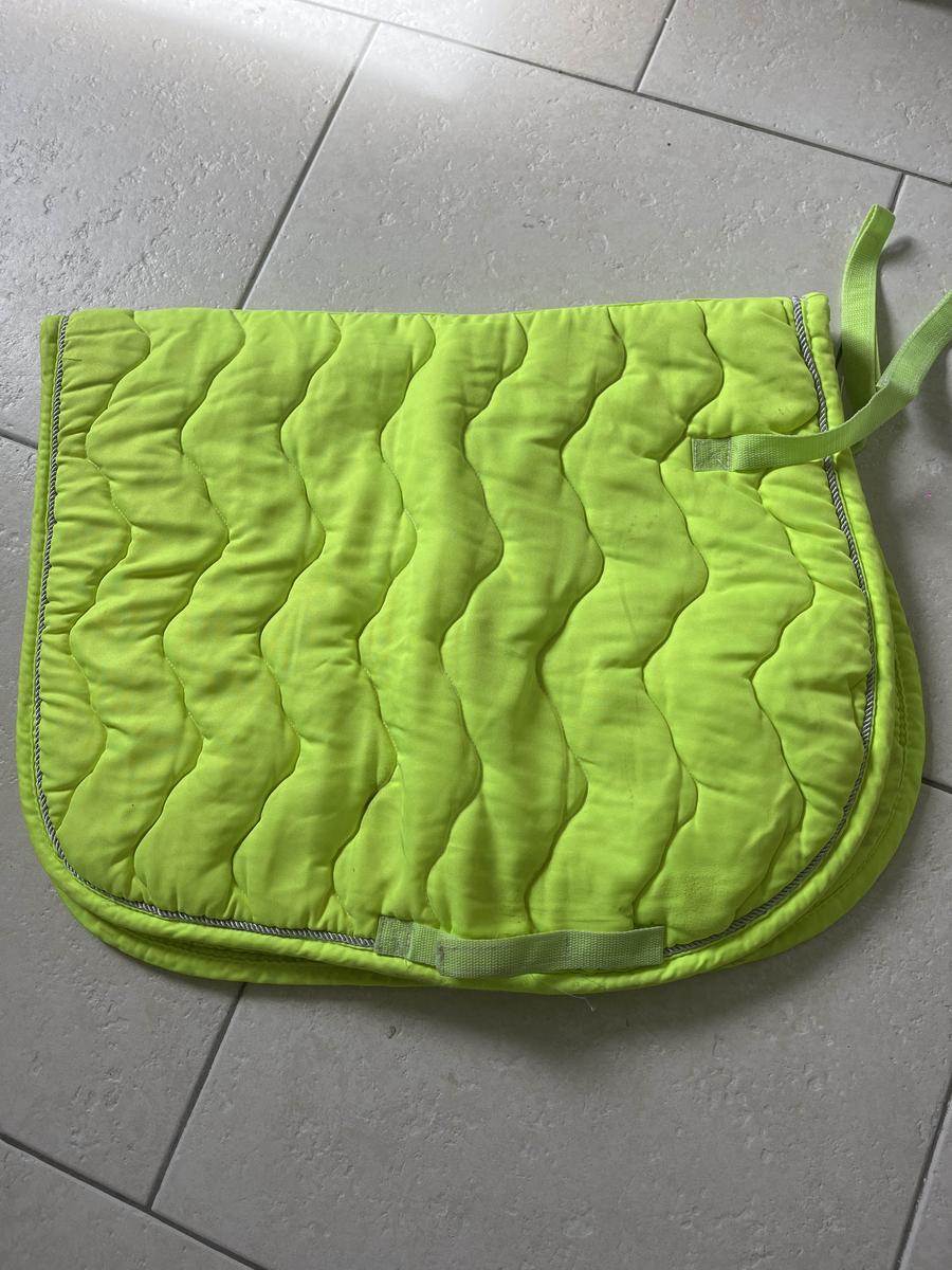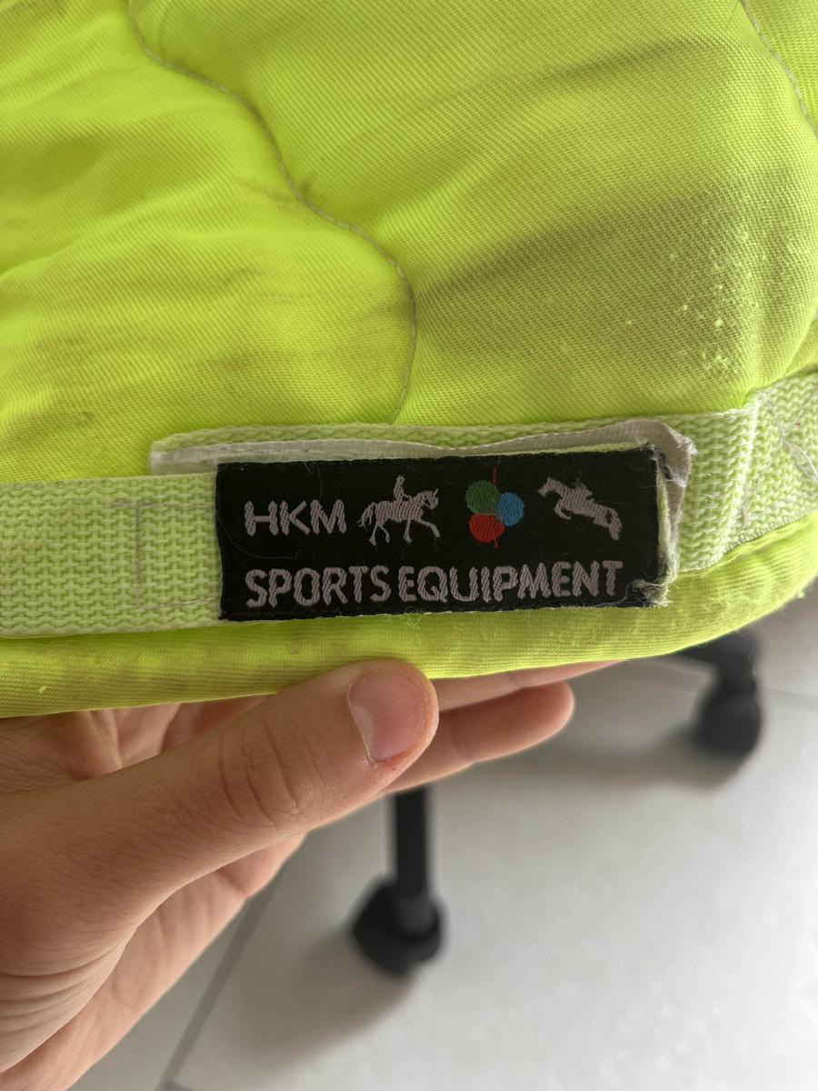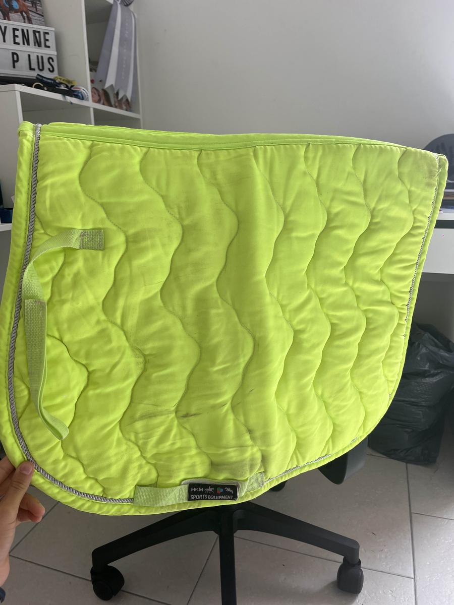 tapis hkm, on me l’a donné je ne l’ai jamais porté, c’est un tapis plutôt pour les balades au vu de sa couleur qui fait comme une gilet réfléchissant, taille poney une tache au niveau de la sangle, sera lavé avant envoi