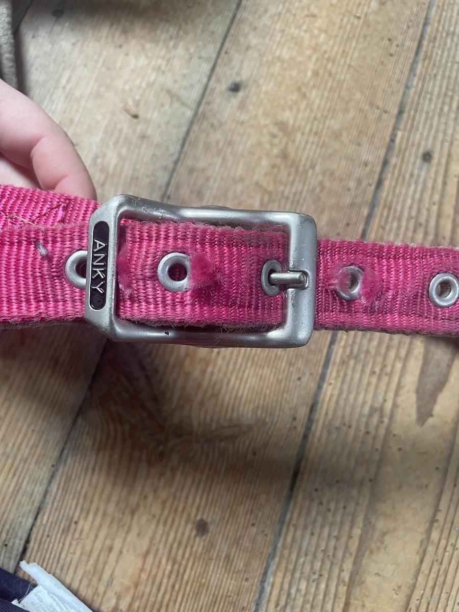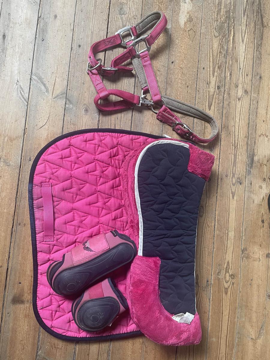 Ensemble rose et bleu marine comprenant : tapis, amortisseur, guêtres, protèges boulets et licol tout est de la marque fouganza sauf le licol qui est un Anky Le tapis et l’amortisseur sont taille cheval et les guêtres/ protèges boulets ainsi que le licol sont taille cob Tout est bon état il y a juste quelques traces du à la selle qui ne partent pas mais se voient pas une fois porter