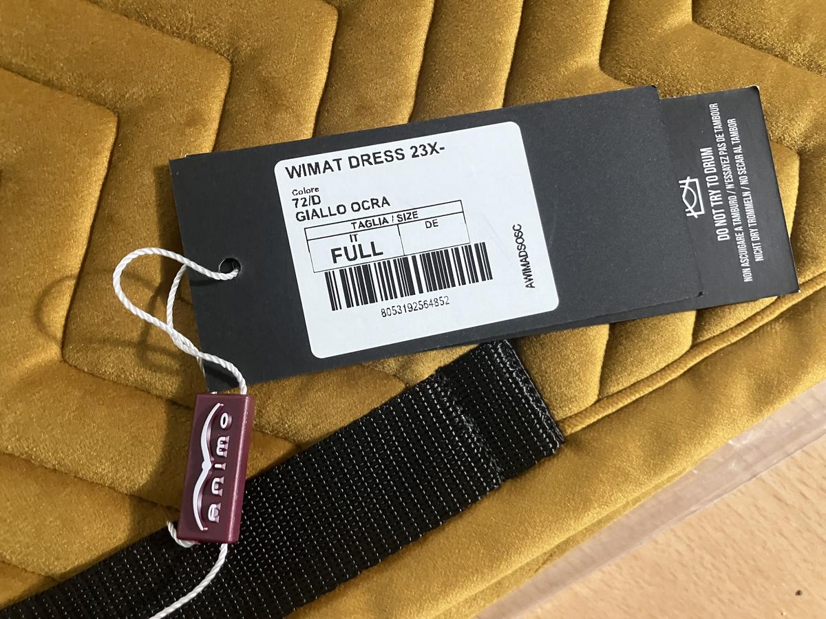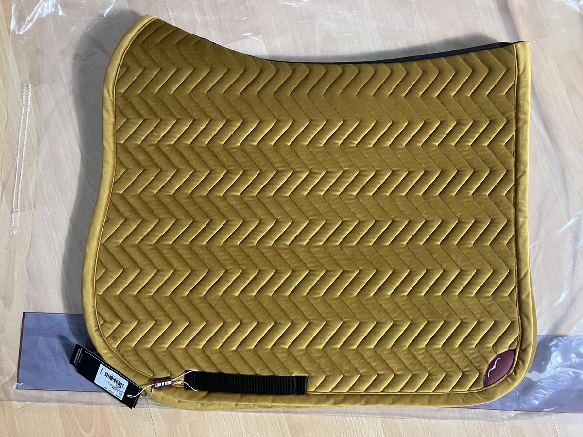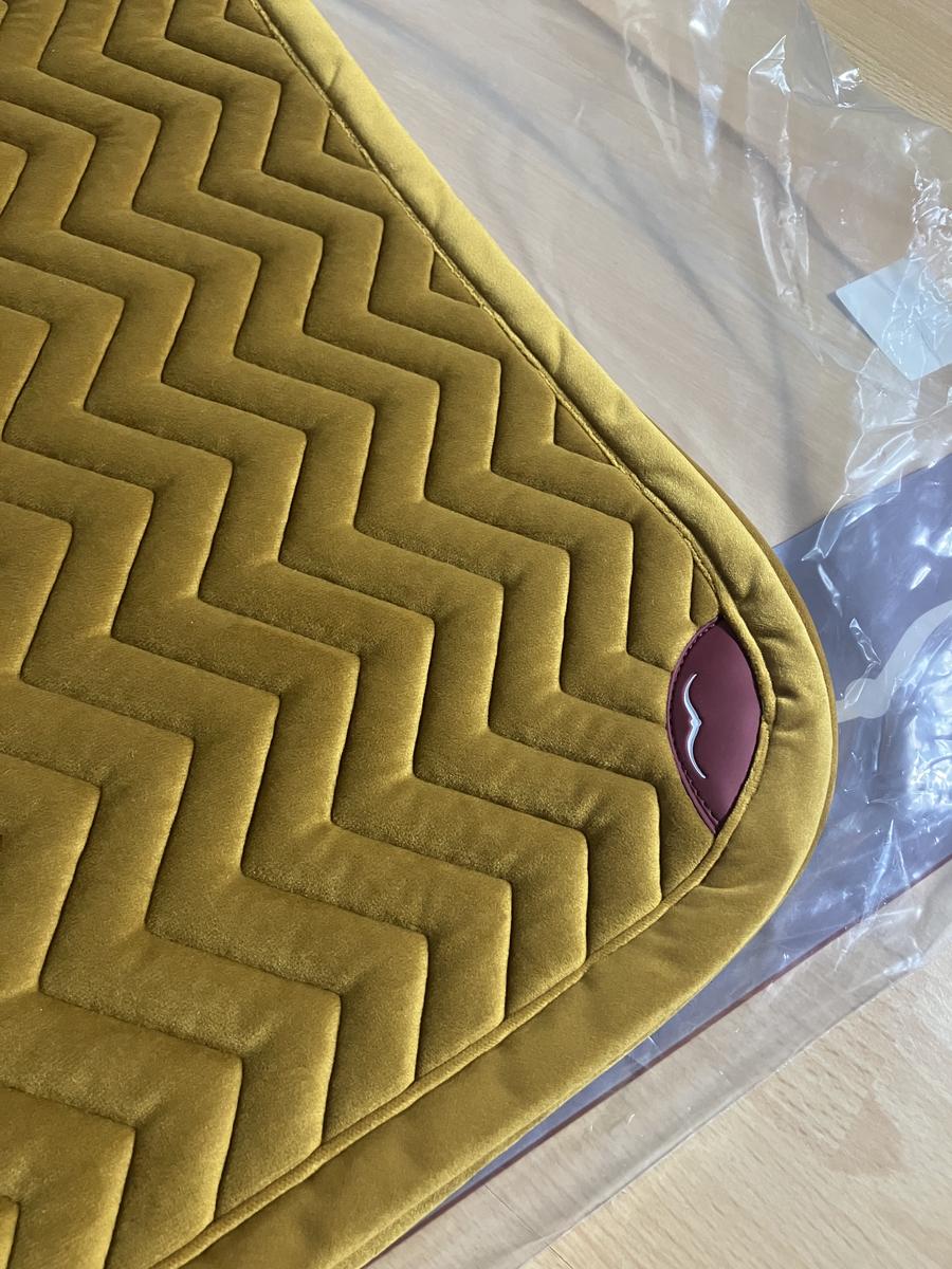 Tapis Wimat Animo, collection 2023, tissu velours, surpiqûre chevron, coloris giallo ocra.