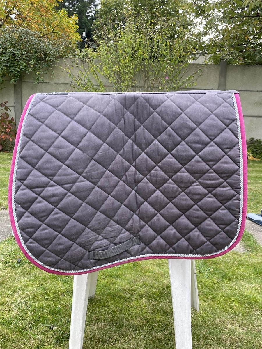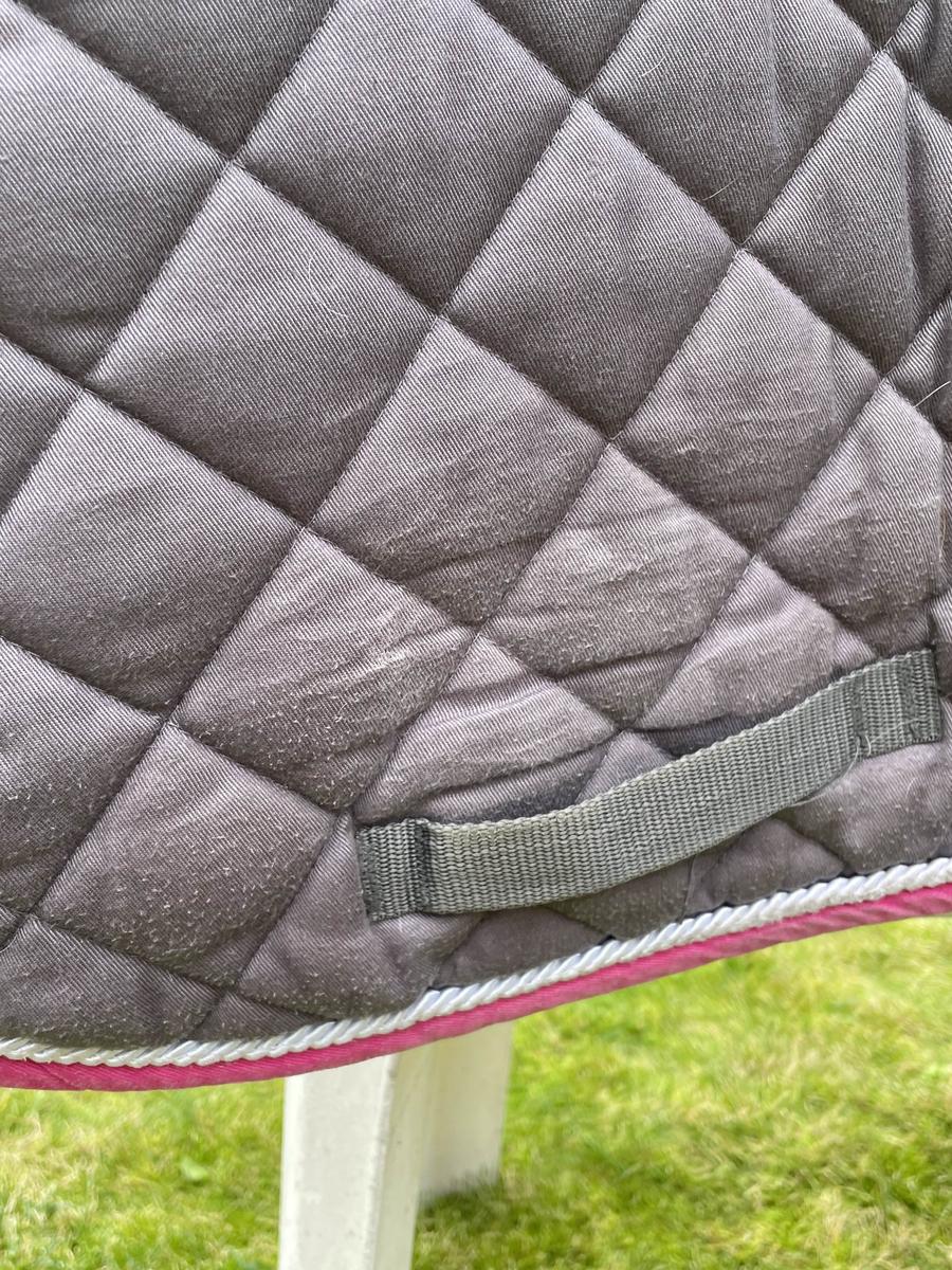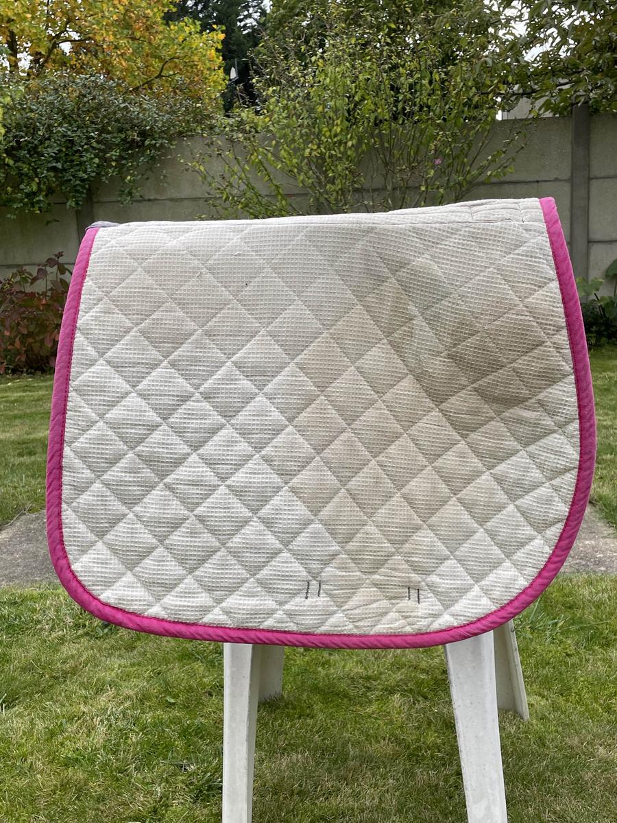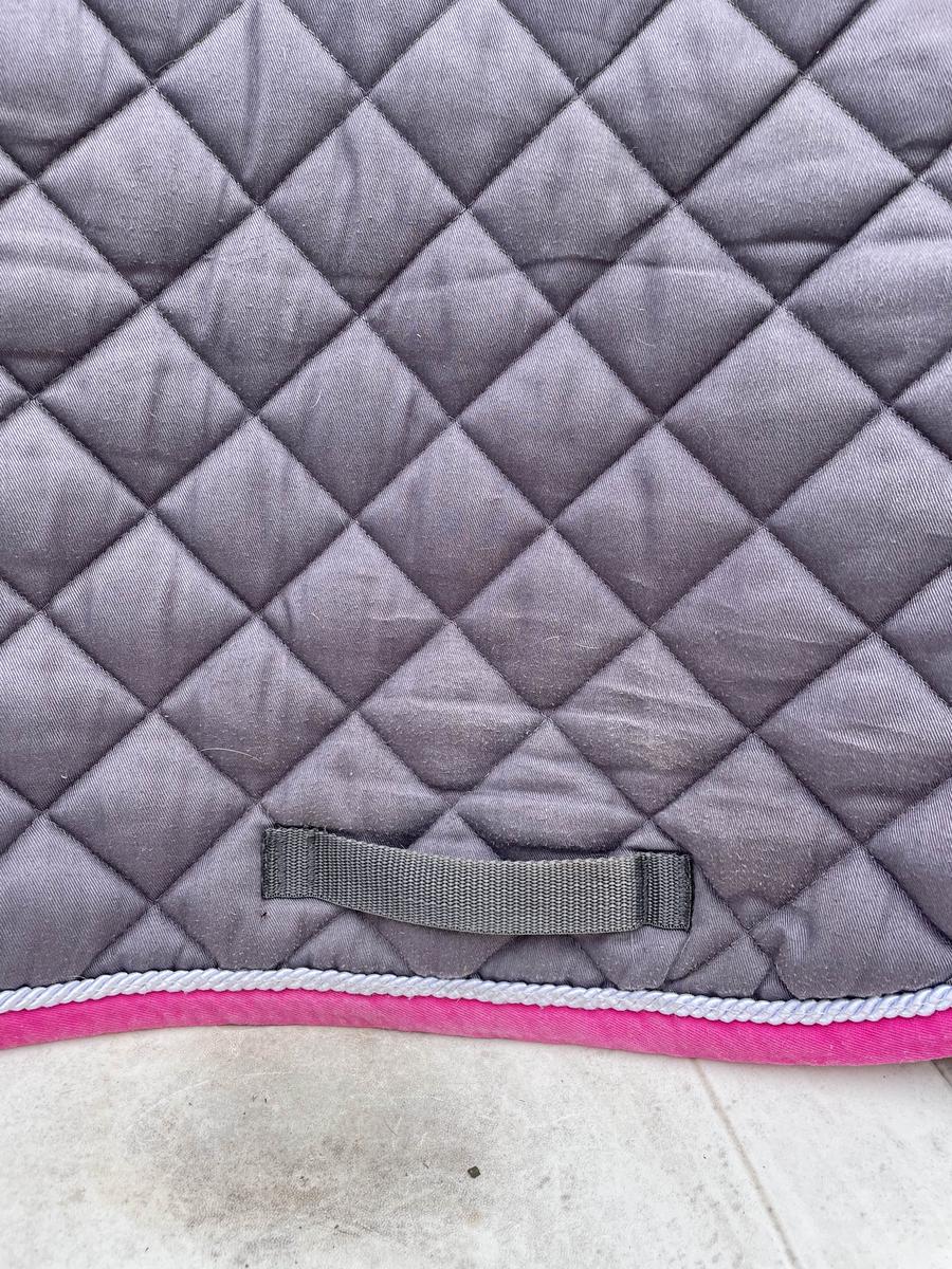 Tapis de chez BeverlyHorse, base gris et bord rose. Dispo également en marine bord rose