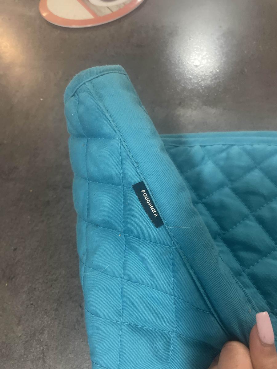 tapis bleu claire, Decathlon, taille, shetland, porter quelques fois, mais en très bon état, et la matière est très pratique pour enlever les poils