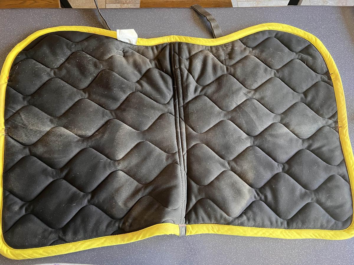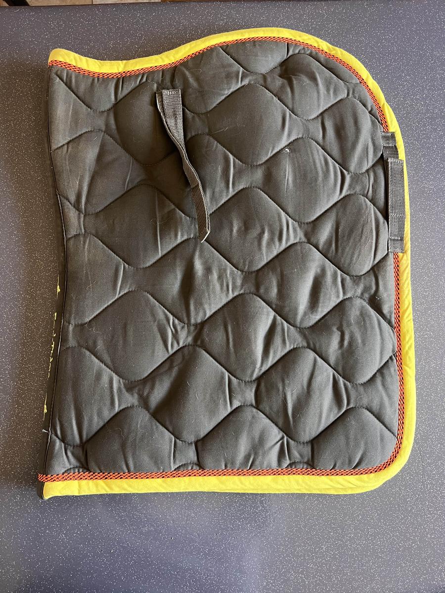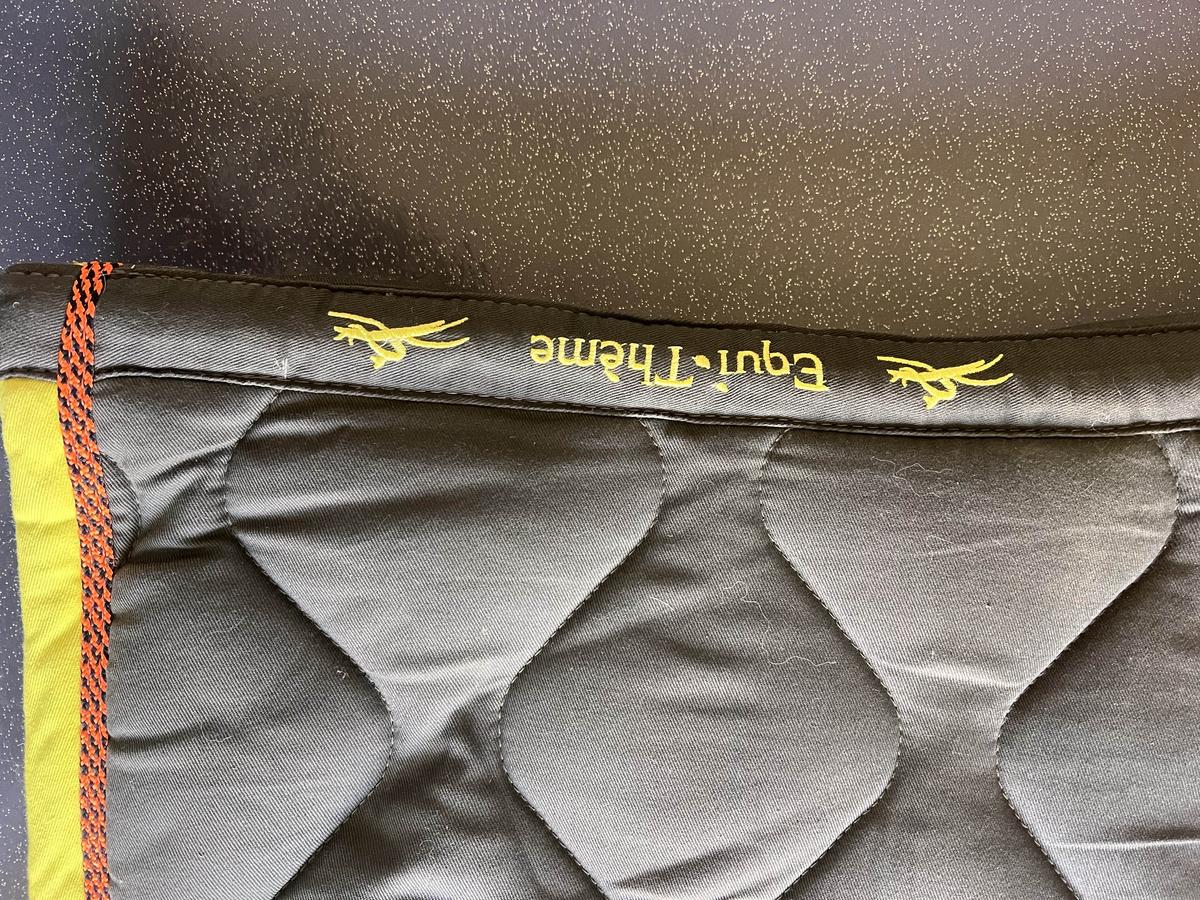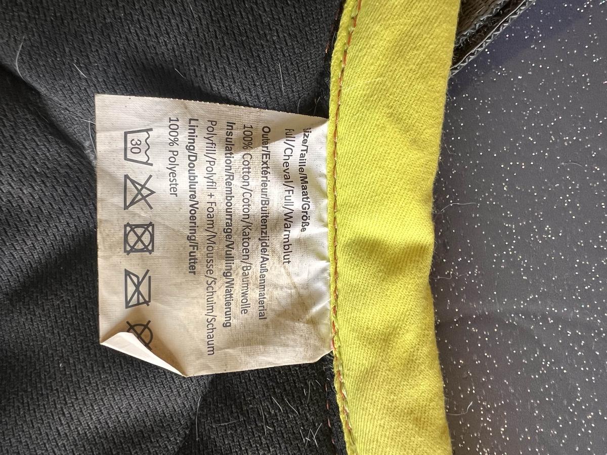Porté uniquement 2 fois comme neuf, taille cheval, noir avec liseré orange et jaune fluo, peut être idéal pour les personnes pratiquant beaucoup de balade pour les voitures.