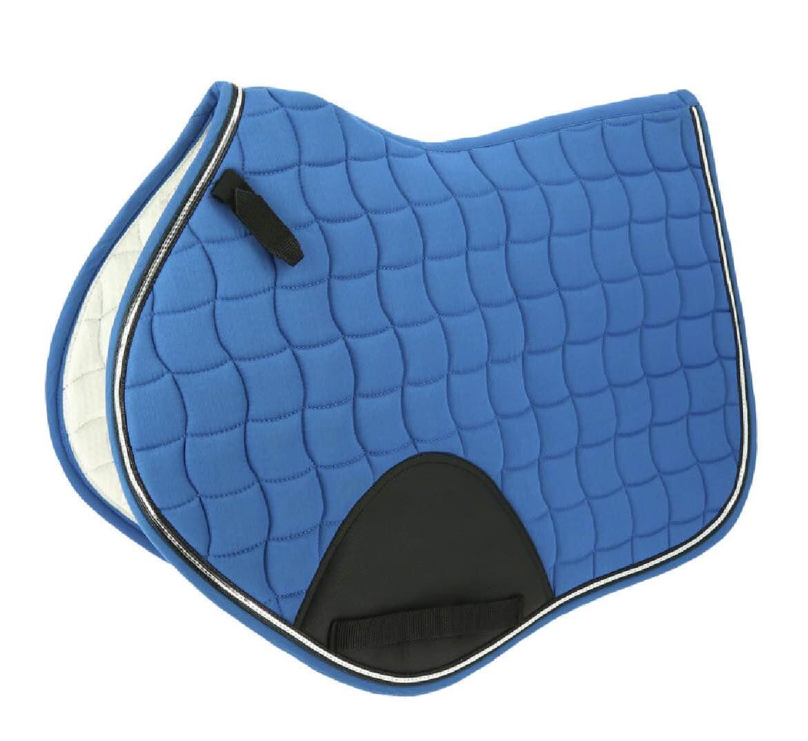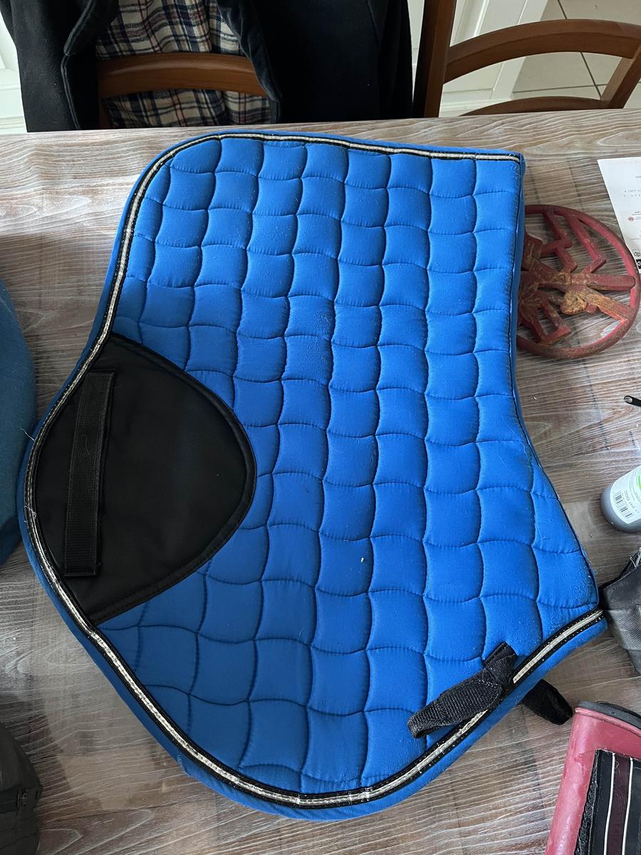 tapis de marque equitheme bleu électrique en très bonne état avec passage de sangle en similicuir