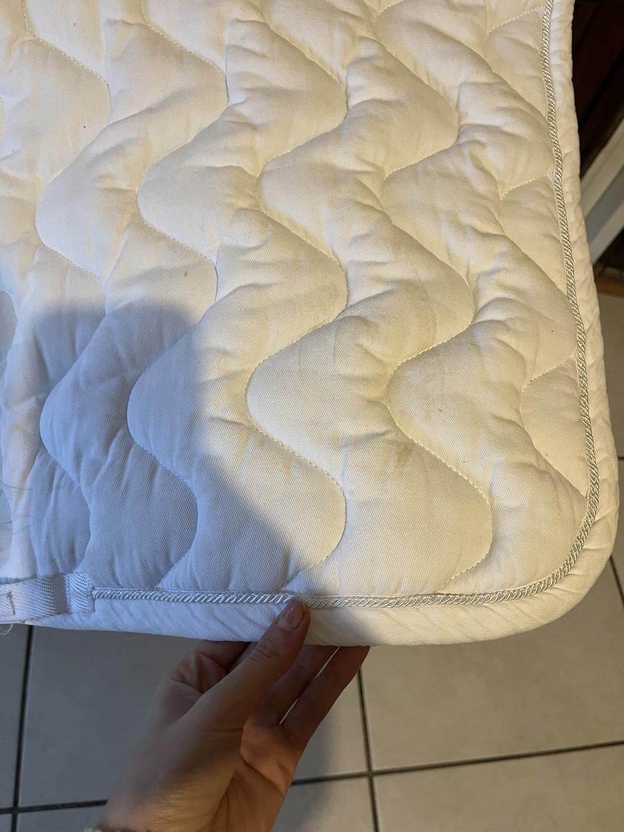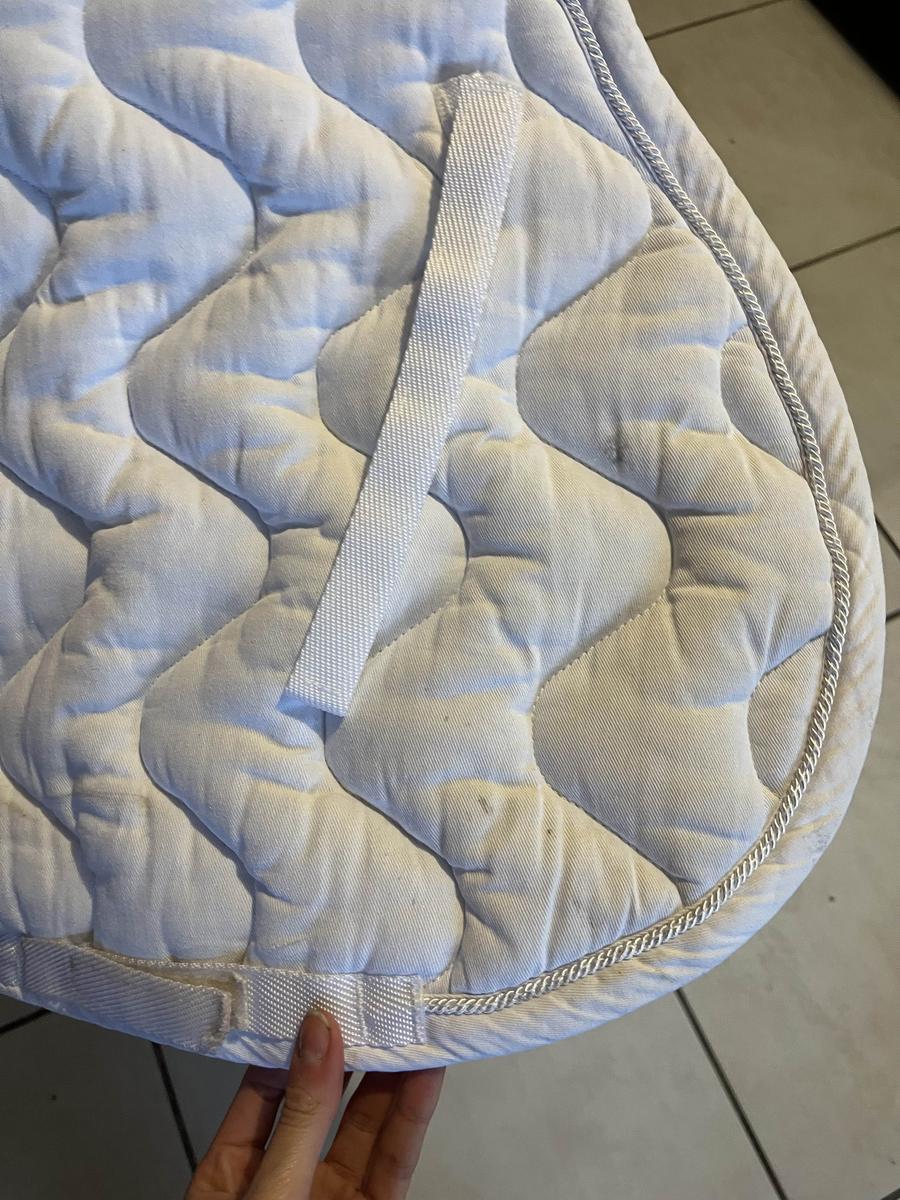 tapis avec quelques défauts : légère tache vers l’arrière du tapis et une au niveau de la sangle + petite tache à l’avant du tapis + à l’intérieur du tapis il y a une couture à céder (possibilité de réparation).