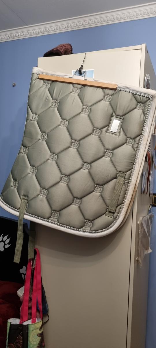 Tapis equestrian Stockholm vert pistache et bordure blanc. Encore tres résistabt malgré l'utilisation. Une réparation interne sur le bord extérieur.