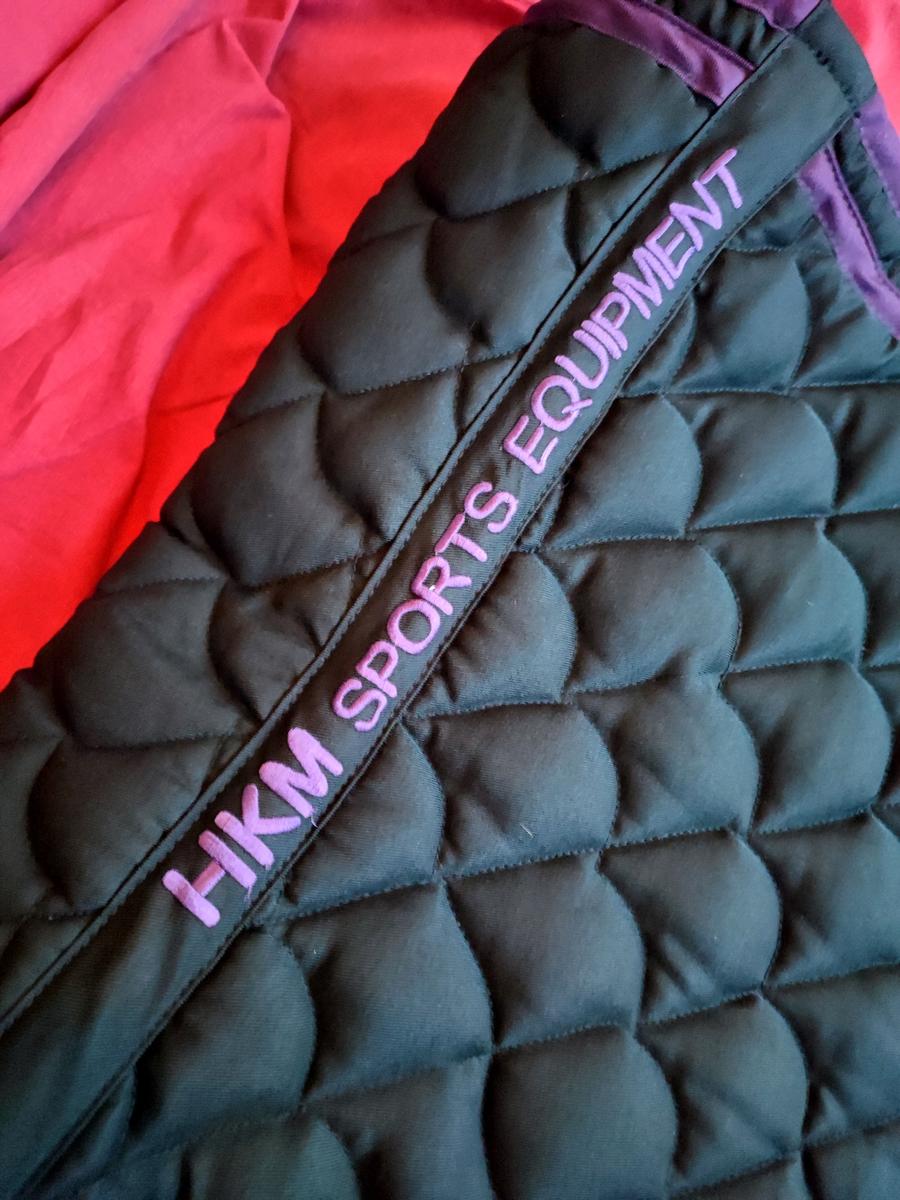 Je vends ce très joli tapis bicolore HKM taille cheval, noir avec contours violet/prune.