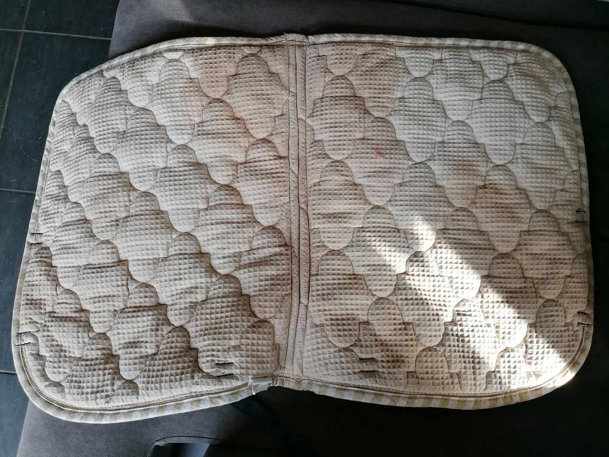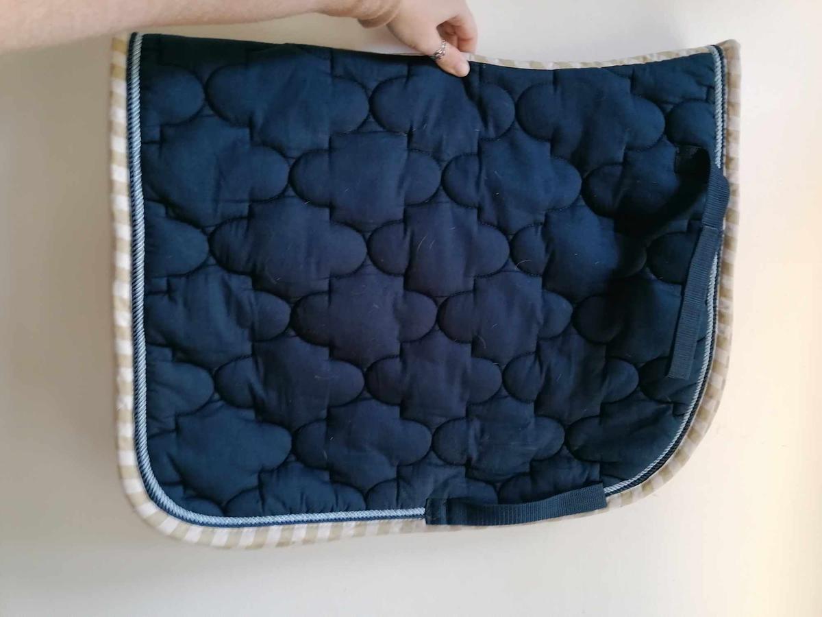 Tapis bleu Equithème en excellent état excepté un côté où il y a eu des tâches roses