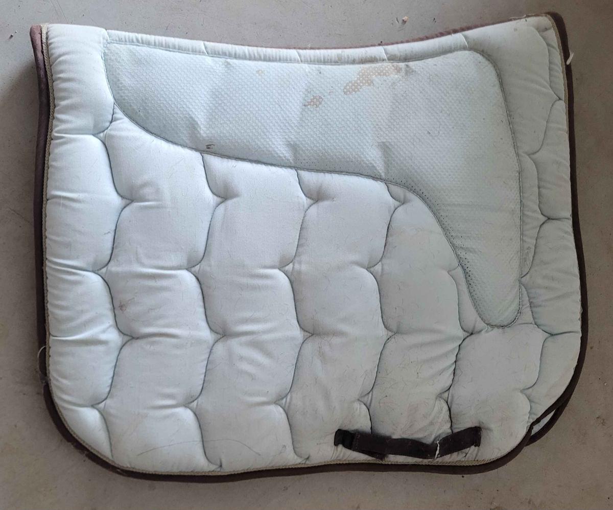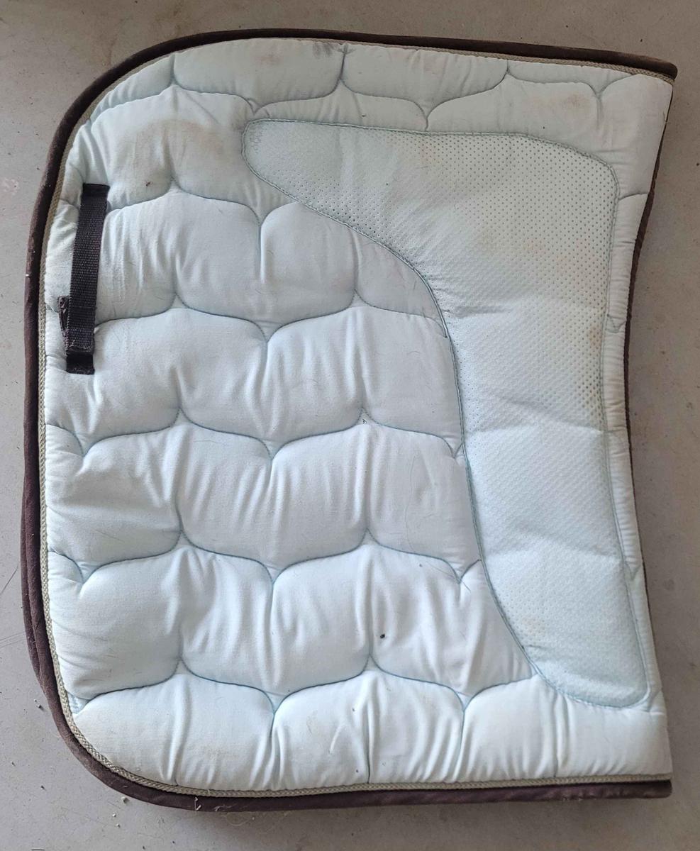 je vends un tapis bleu ciel, il a casiment pas servi. Il a seulement une tache sur le dessous qui est invisible sous la selle.
