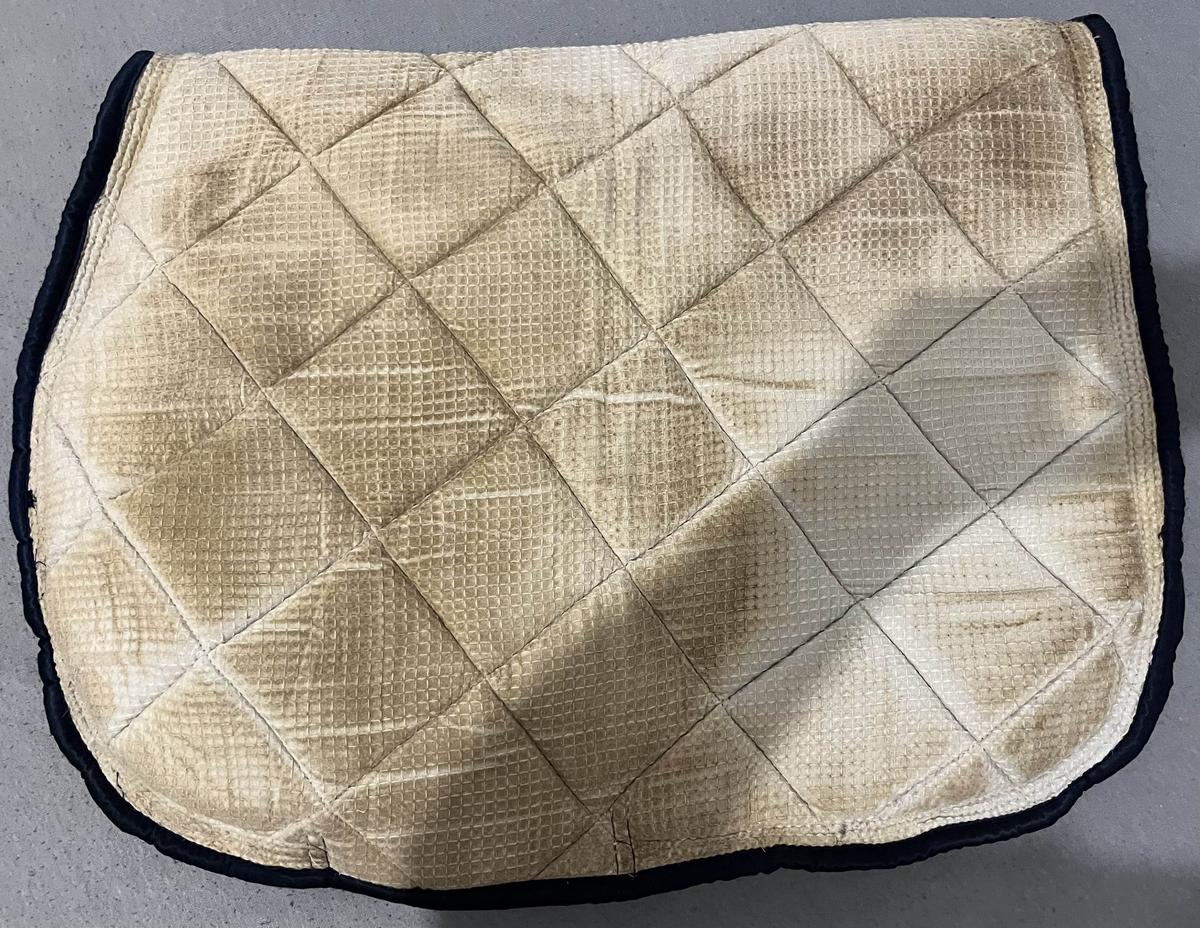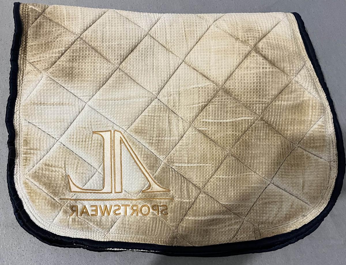 Tapis Alexandra Lederman, bleu marine avec liserer blanc et or. Excellent état, tacher en dessous à cause de l’utilisation mais ne se voit pas une fois porter. Le tapis est très épais, et est satiné, taille CSO. Taille COB.