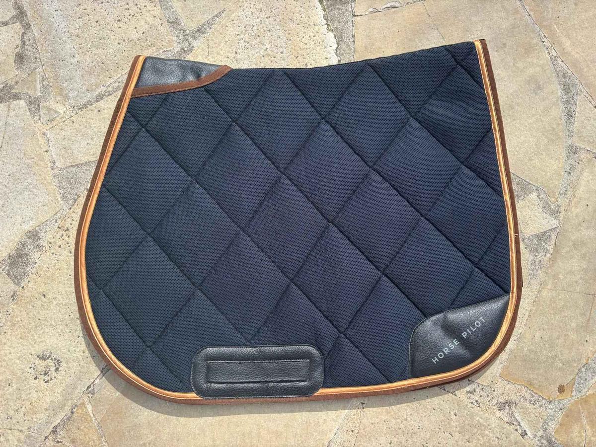 tapis de selle Horse Pilot en mesh bleu marine liseret marron. Élégant, technique et très respirant. Bon état.