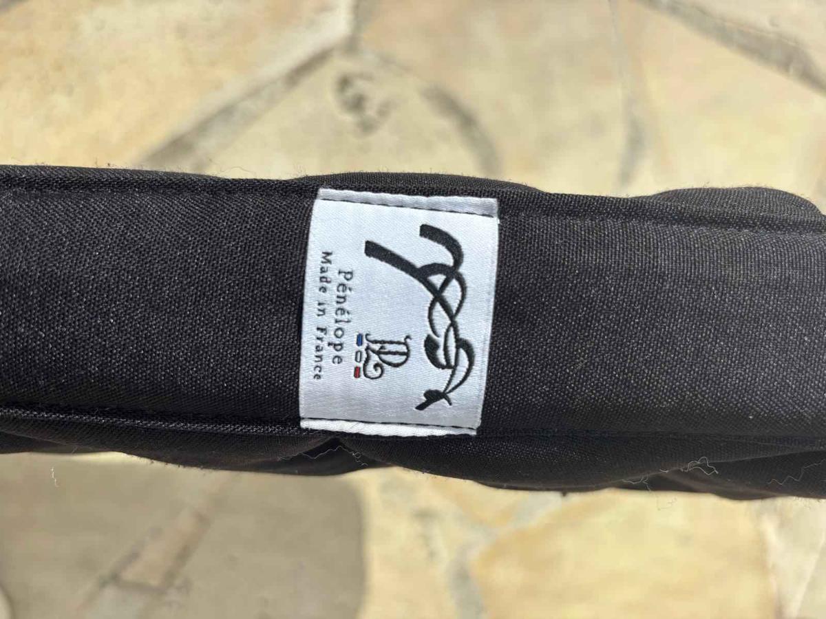tapis de selle Point Sellier classique Penelope Leprevost noir et rose gold. Doté d'un matelassage épais. Très confortable pour le cheval, il a une doublure intérieure en nid d'abeilles alvéolé qui laisse l'air circuler, absorbe et évite un excès de transpiration. Sa coupe bien dégarrottée permet une pose facile. La forme du tapis s'adapte parfaitement au dos du cheval. Il est également doté de deux passants de sangle pour qu'il ne bouge pas sous la selle. On retrouve le Logo PL sur le coté...