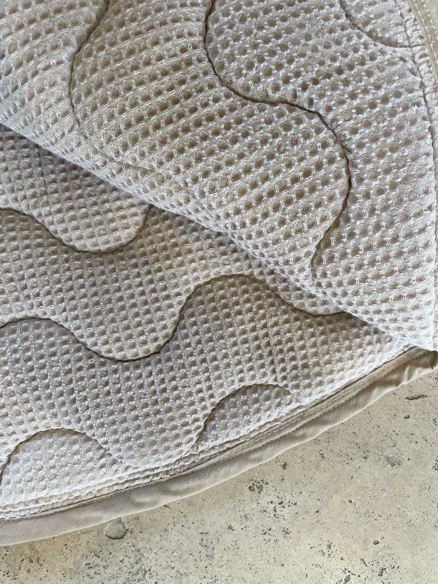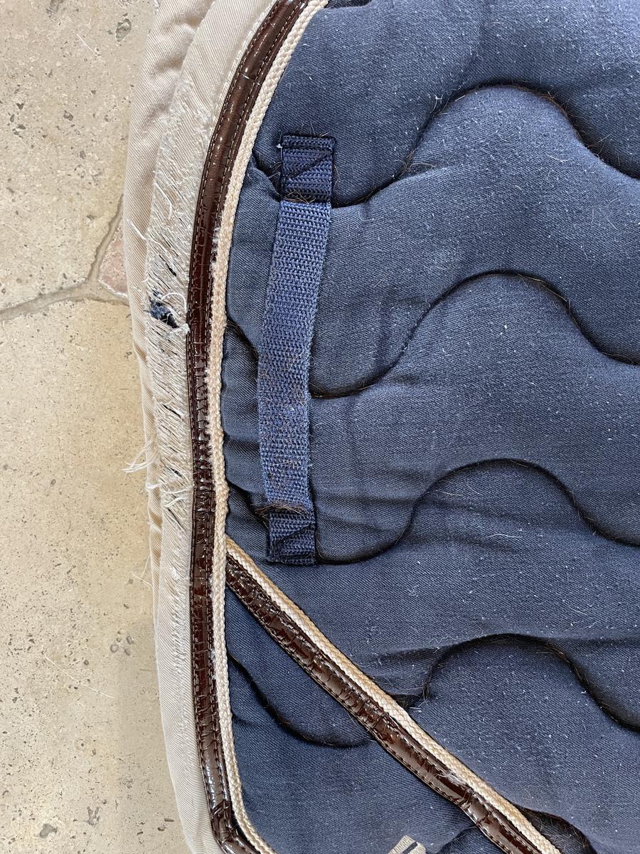 Tapis bleu marine liseré marron, et liseré en corde beige.