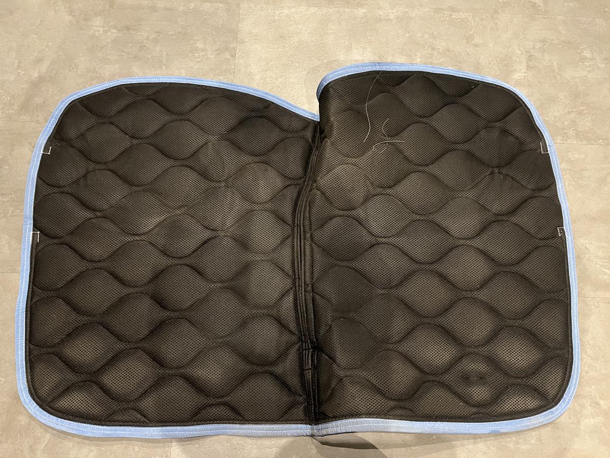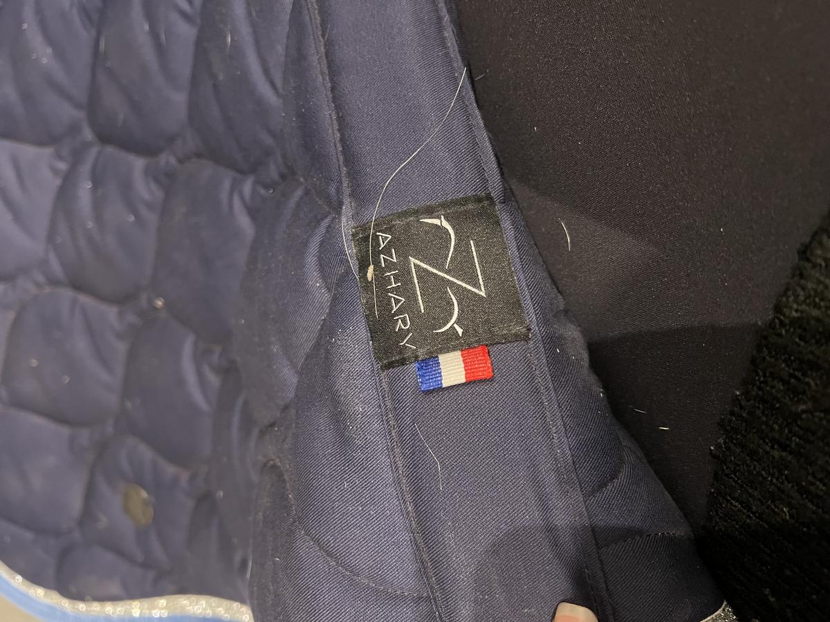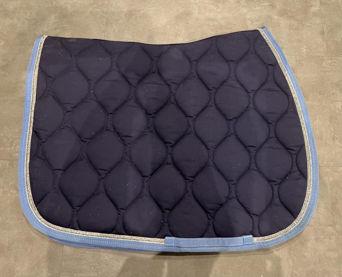 Tapis Azhary forme CSO taille cheval. Couleur bleu marine avec liseré bleu ciel et argenté. Utilisé seulement 2 fois comme neuf.