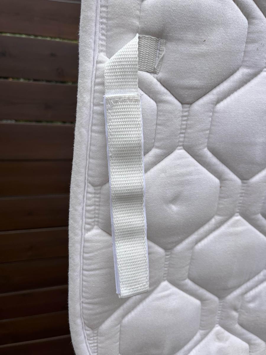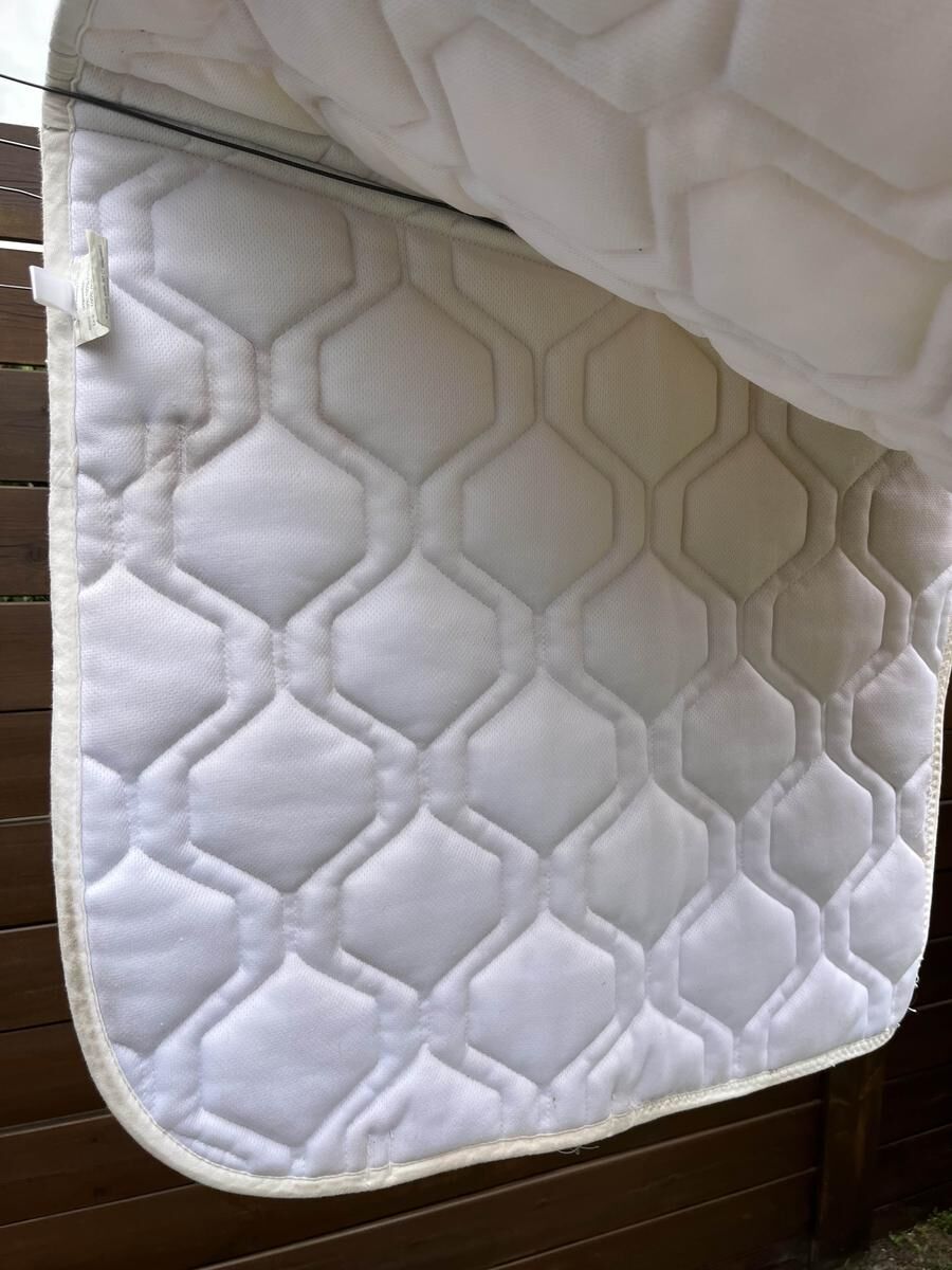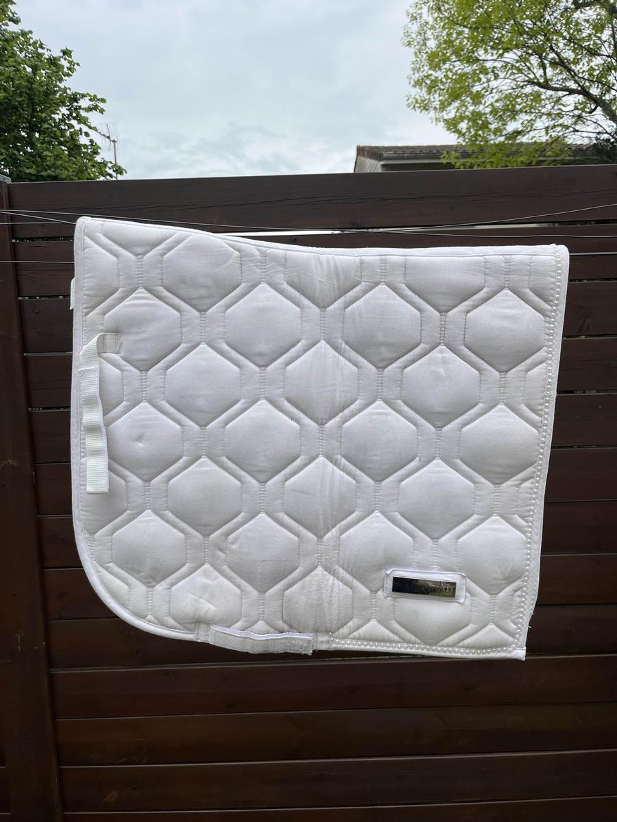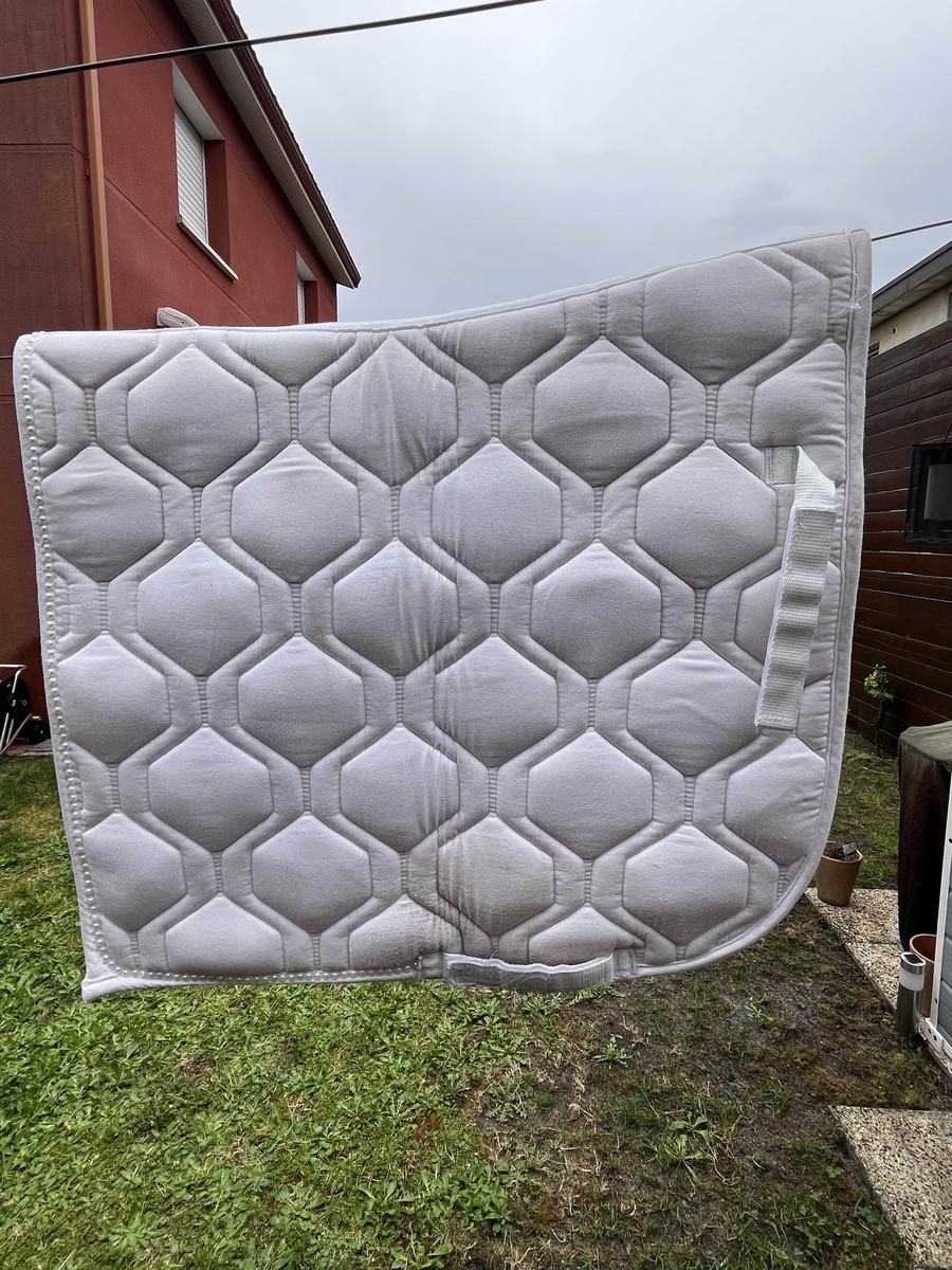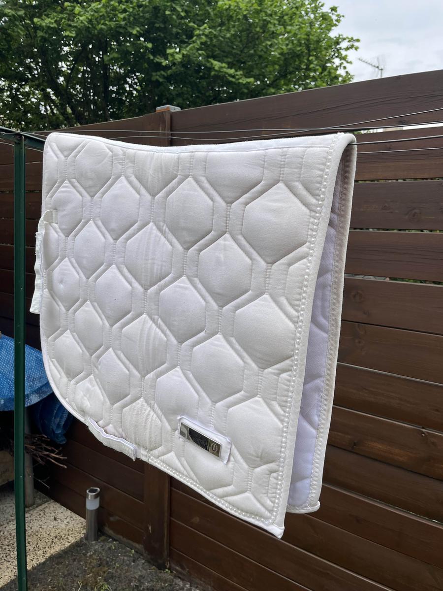 Tapis de dressage de marque PS of Sweden, couleur blanche avec bordure perlée. Taille Full mais convient très bien pour un poney. Utilisé toute une saison jusqu’aux championnats de France. Bon état. Je reste disponible pour toute question.