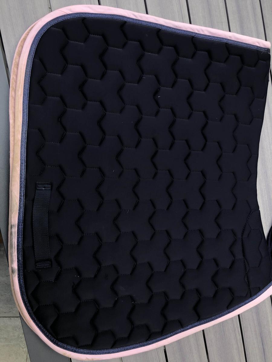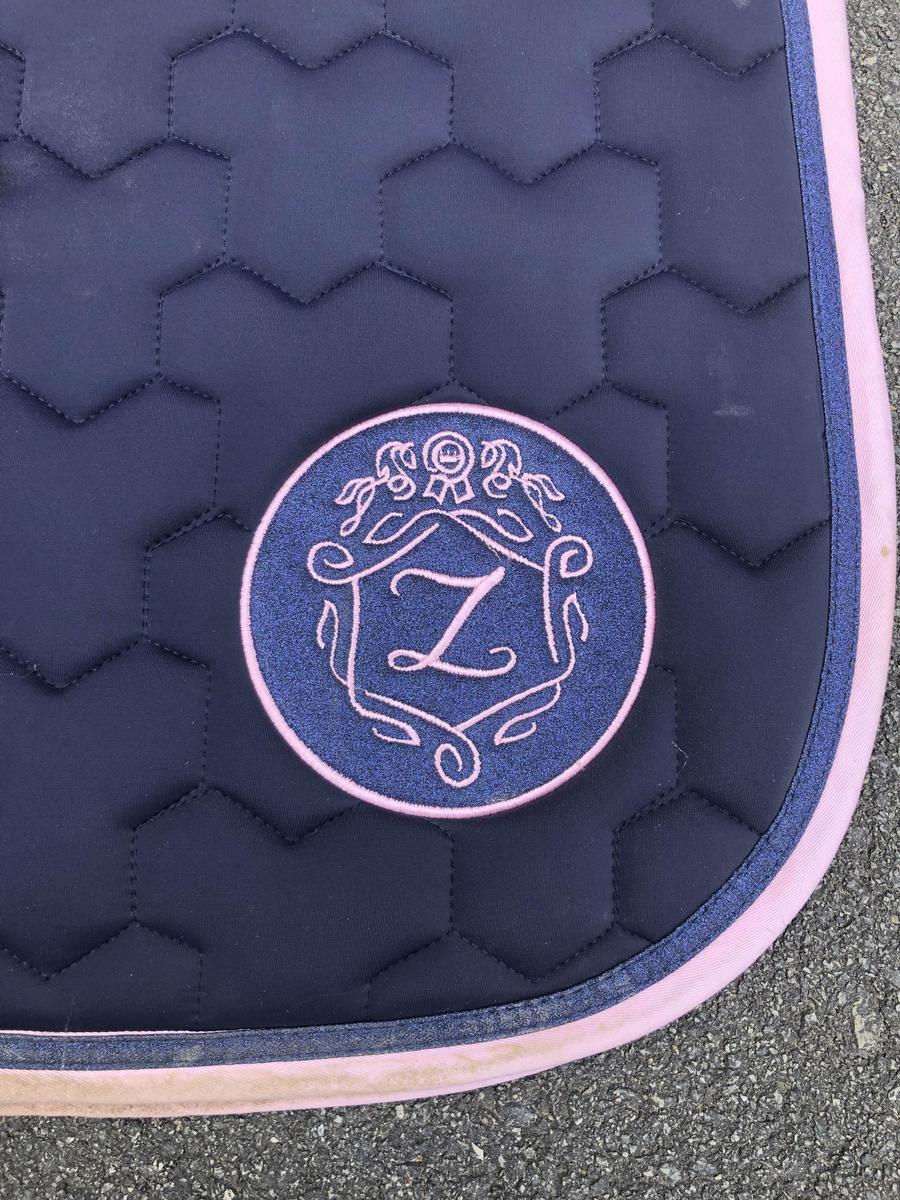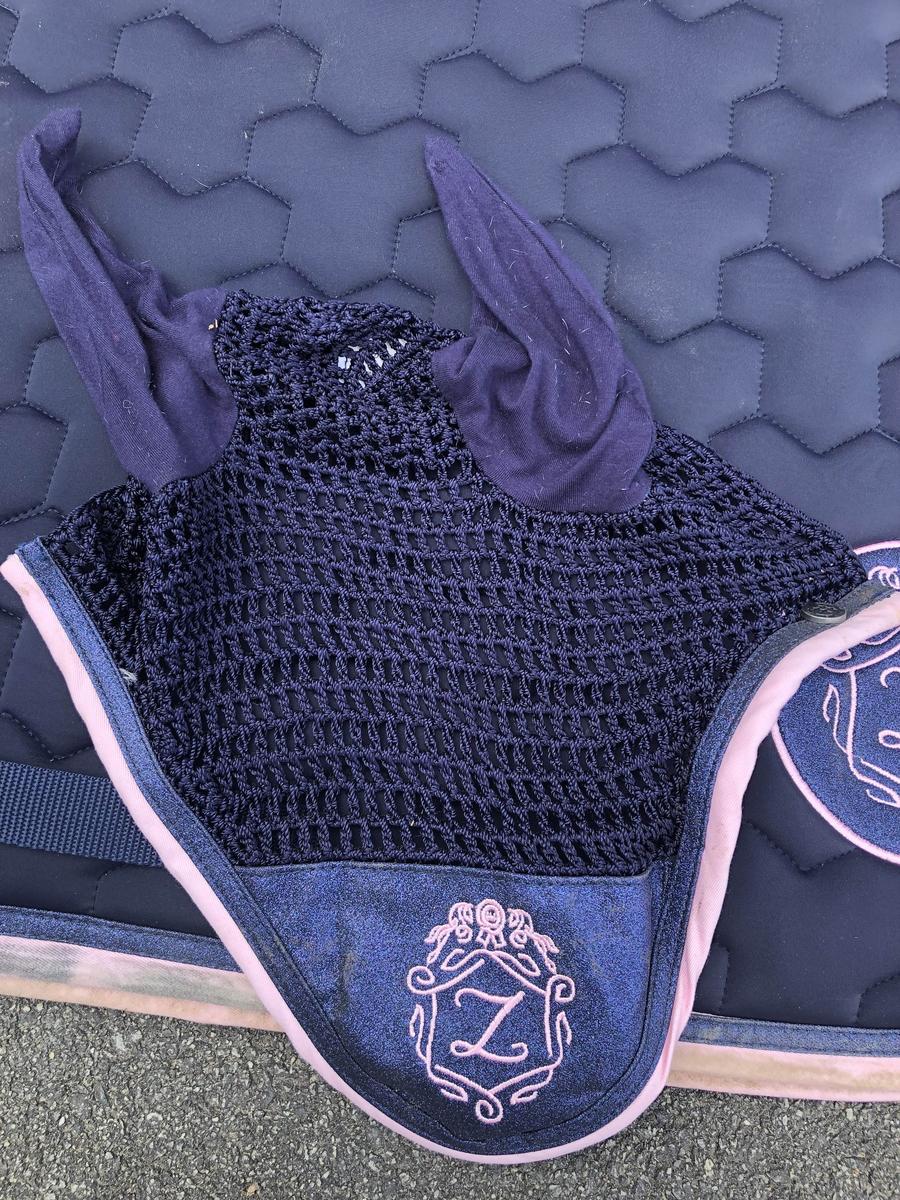 ensemble tapis et bonnet bleu marine et rose taille poney