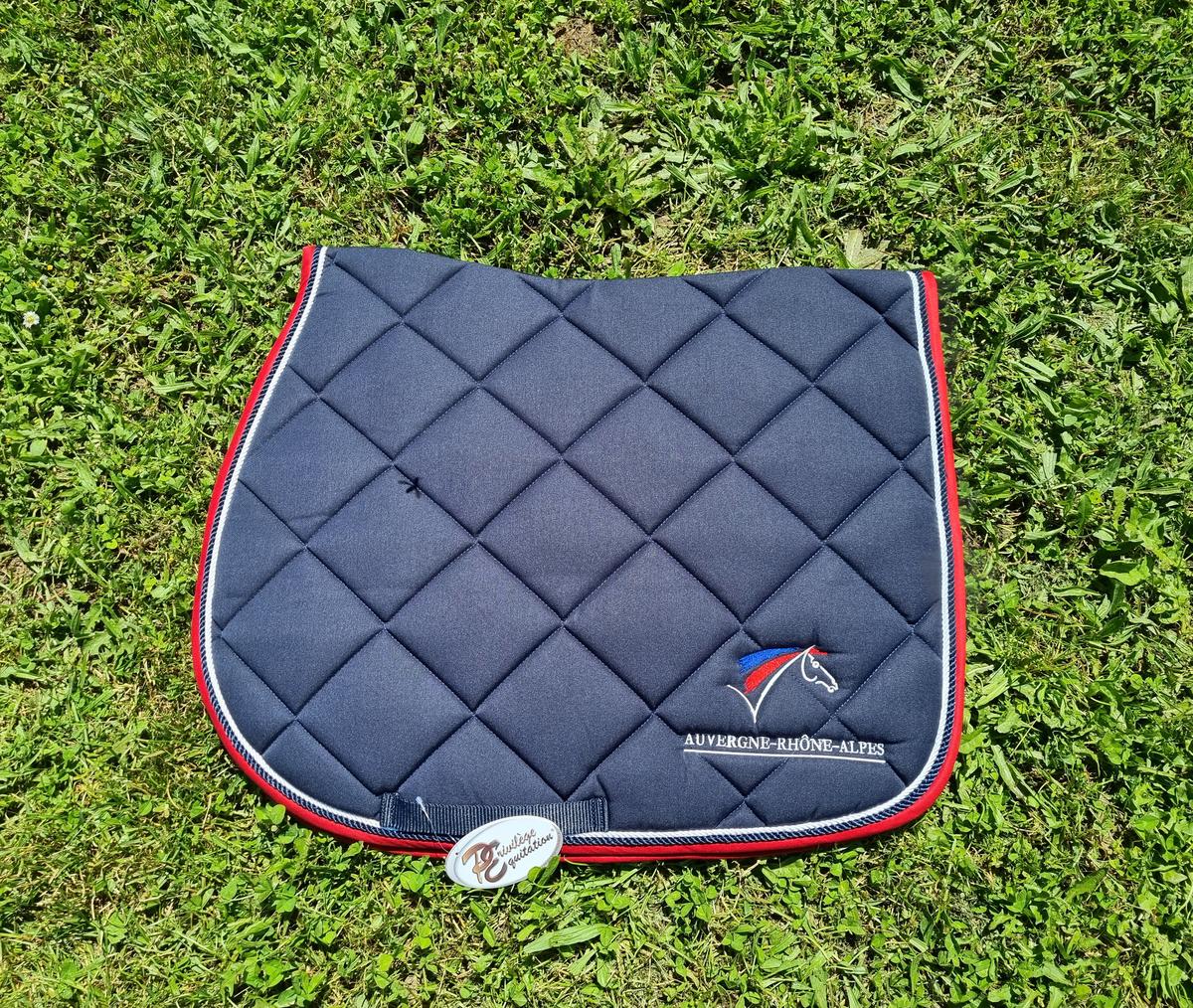 Couleur bleu marine, floqué la région, liserai bleu blanc rouge.