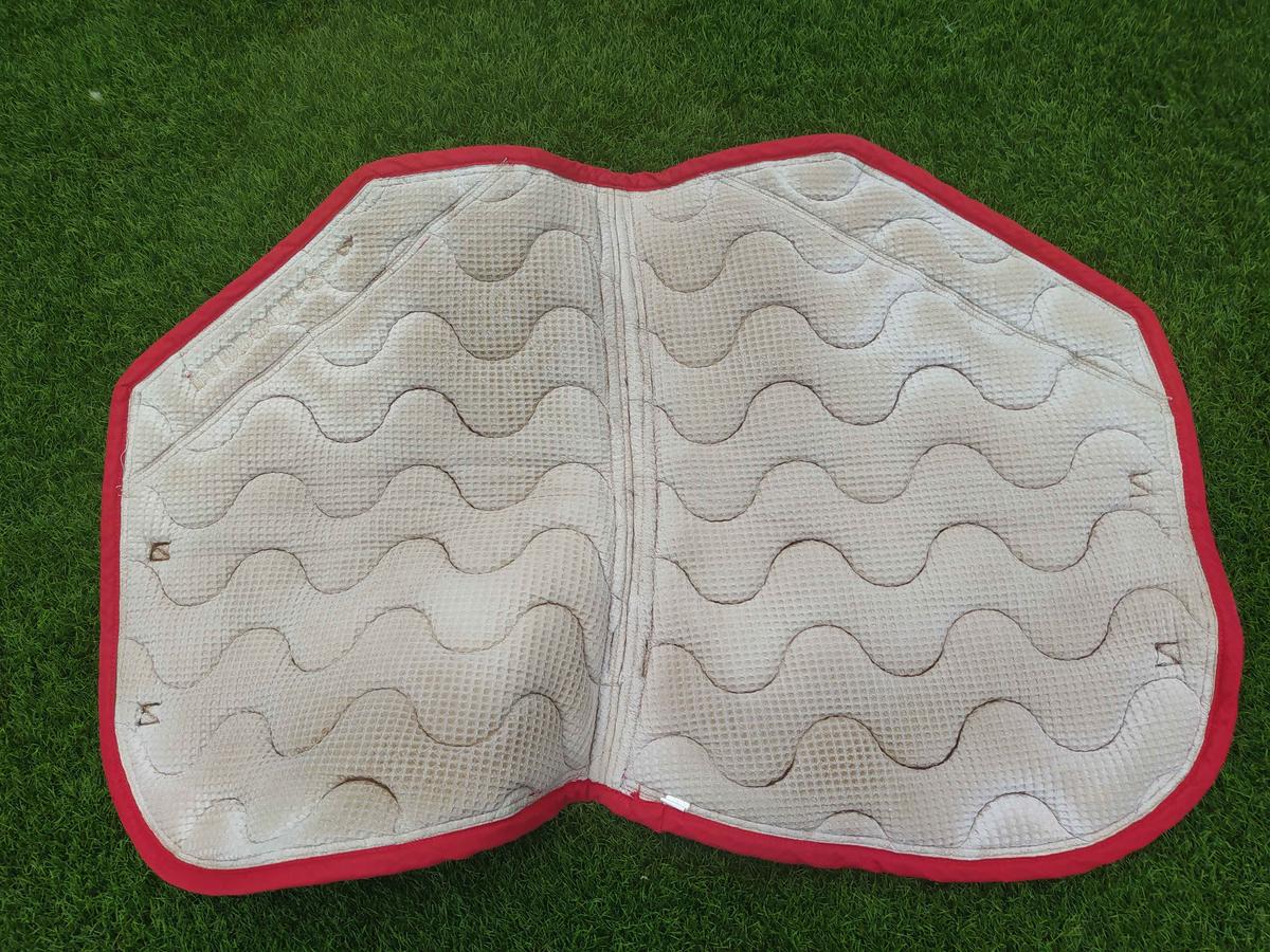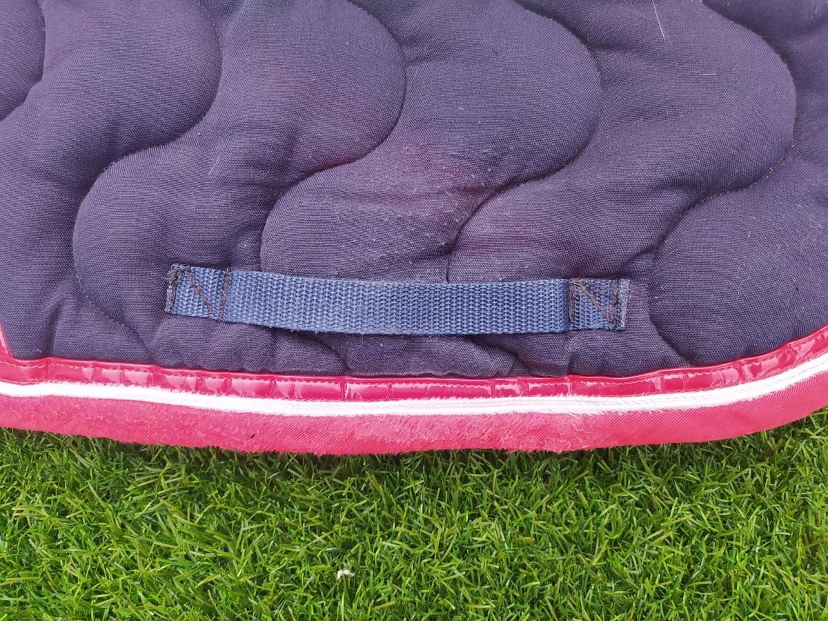 Tapis Paddock Sport coupé sport bleu marine, rouge & blanc en parfait état malgré les traces d'usures présentes au niveau du passage de sangle, qui sont invisibles sous la selle à vendre 38€