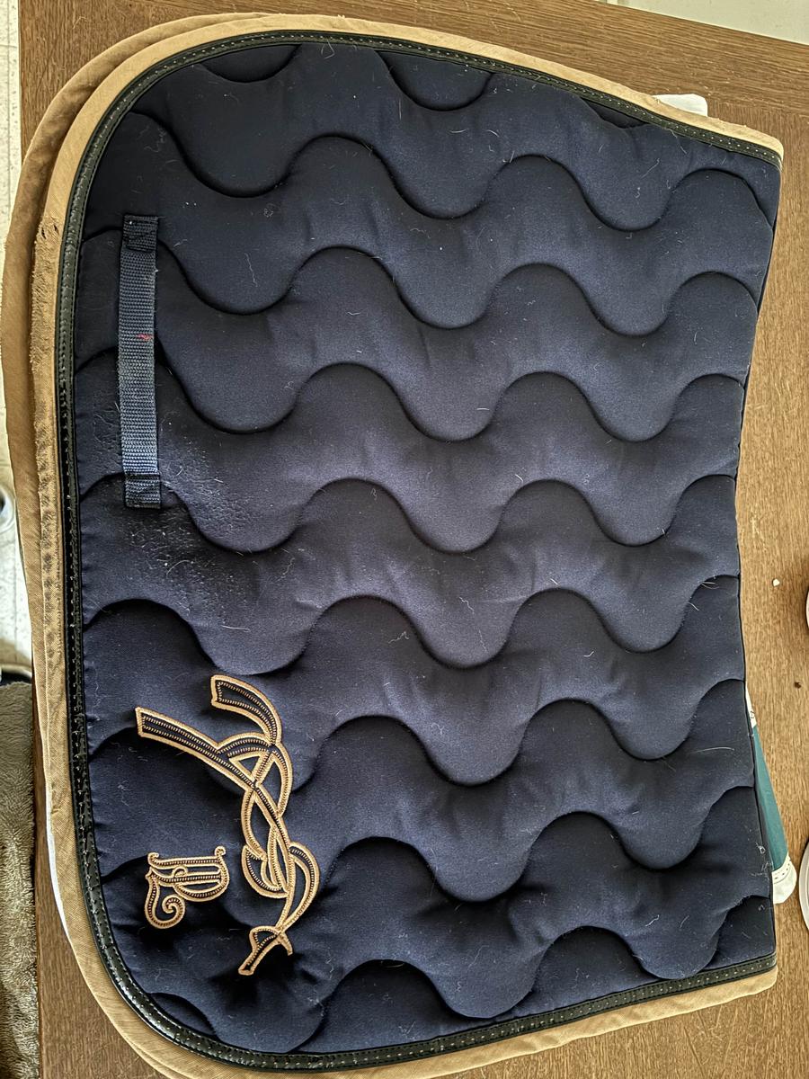 tapis Pénélope leprevost taille cheval bleu marine et camel , bonne état mais quelque marque d’usure au passage de sangle