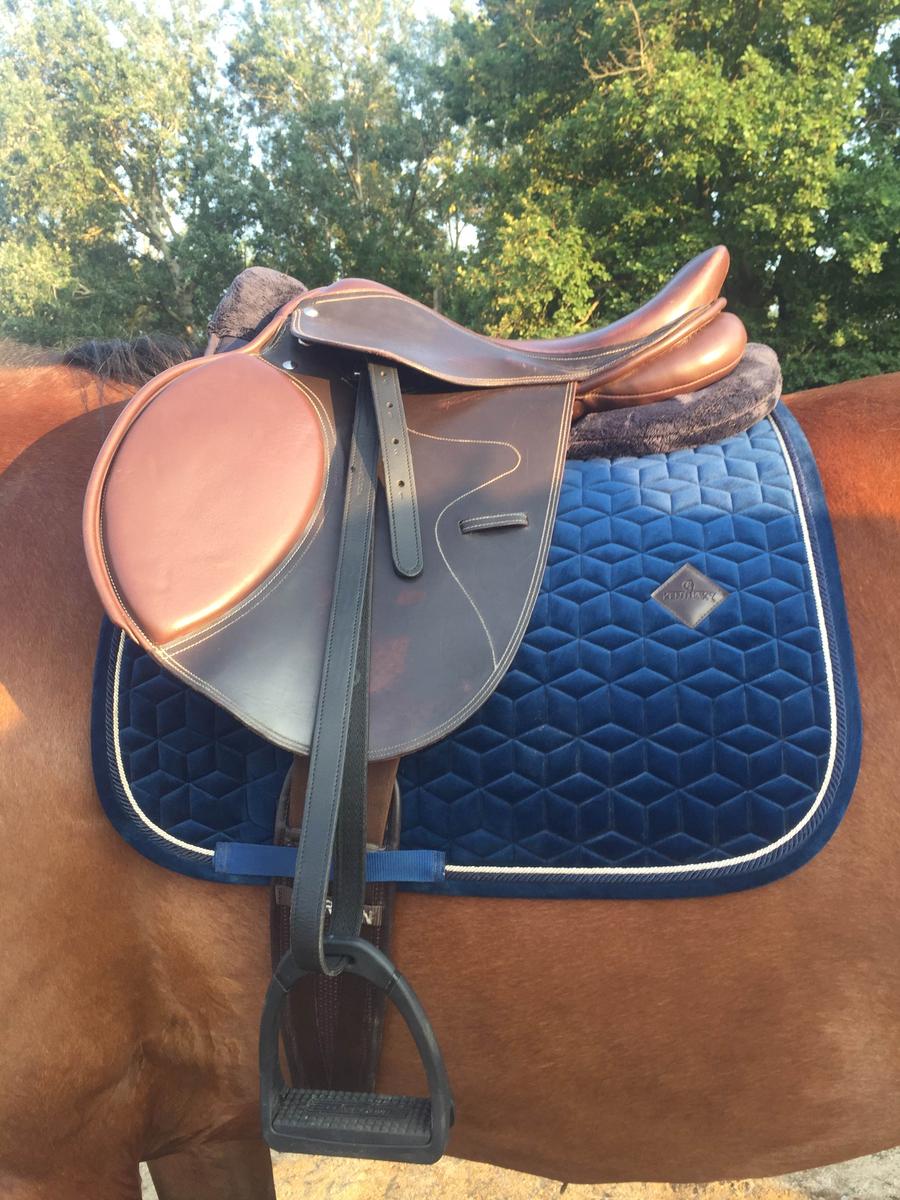 Tapis bleu marine de la marque Kentucky, coupe dressage, en excellent état. Utilisé avec soin, aucune tache, couture impeccable. Confortable pour le cheval, très beau en concours comme à l’entraînement. Je le vends car je change de couleur, mais il est encore comme neuf !