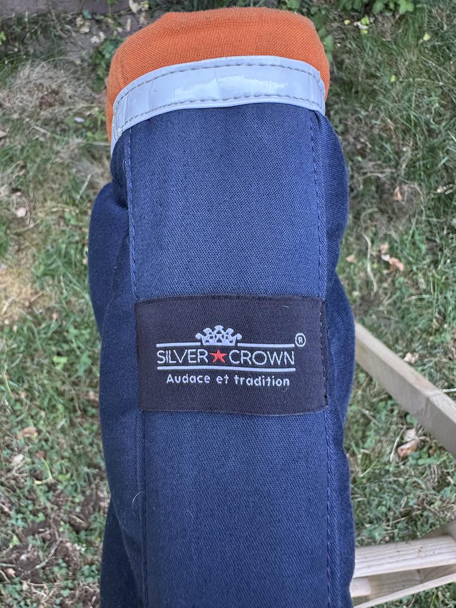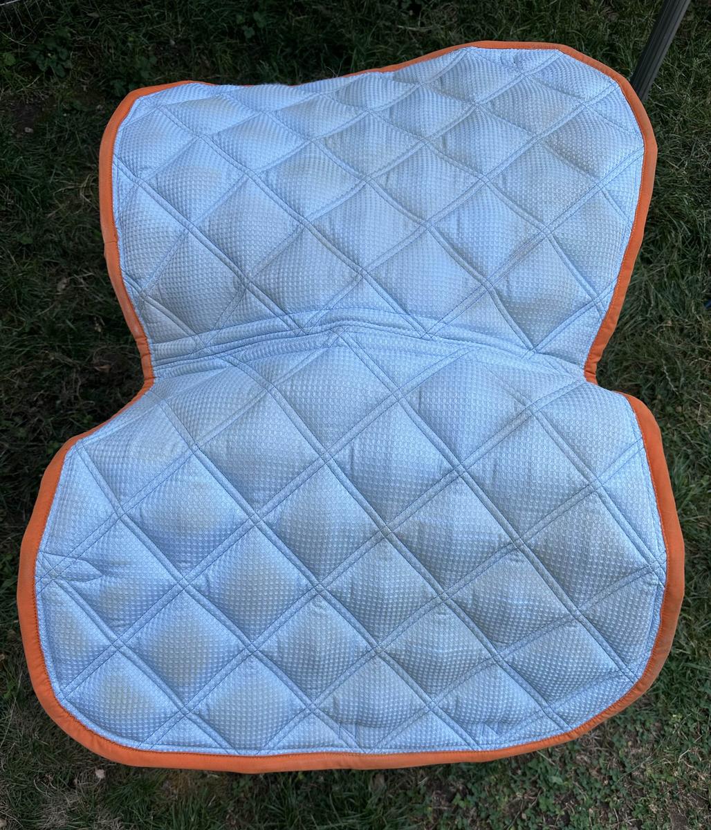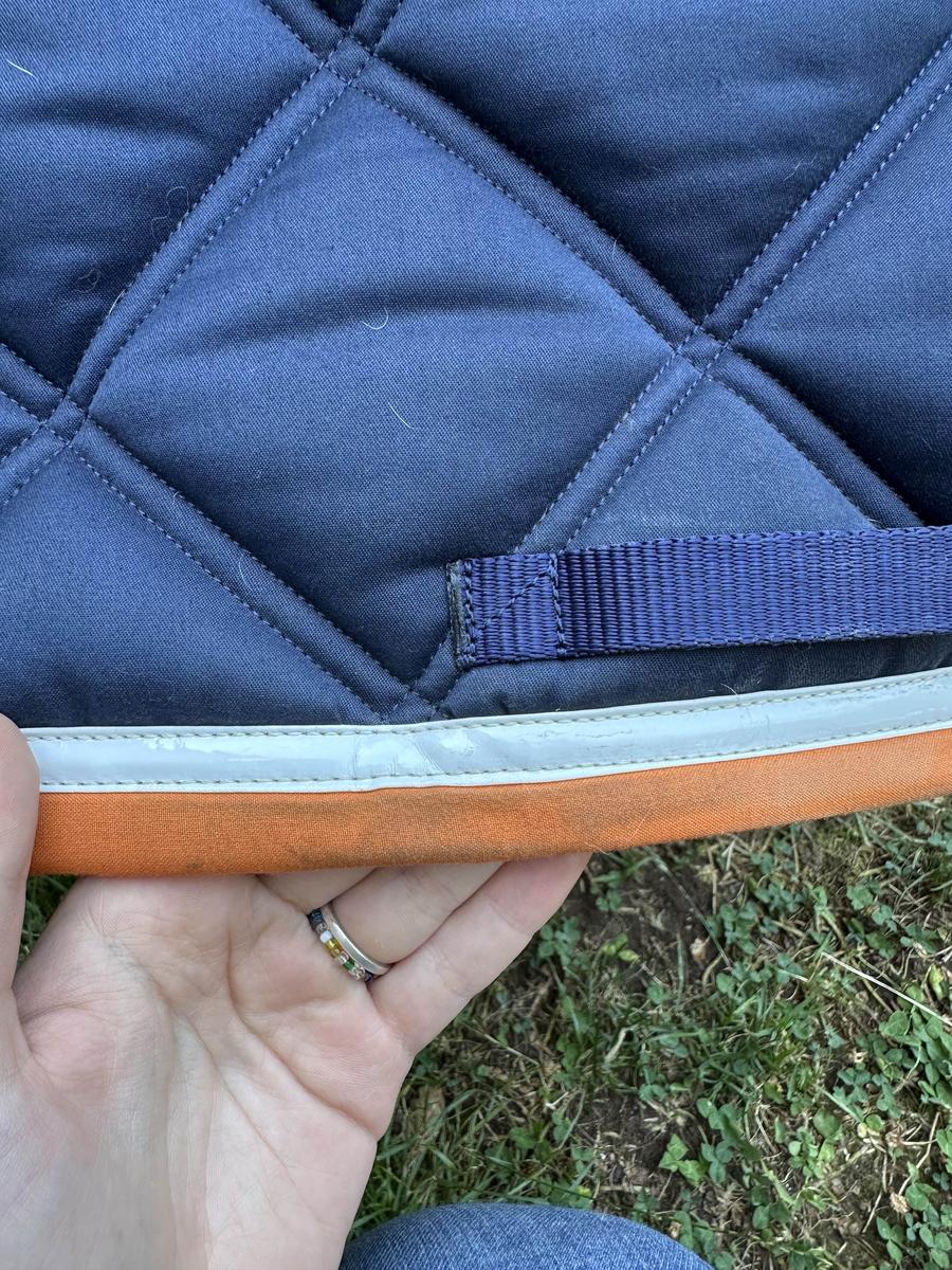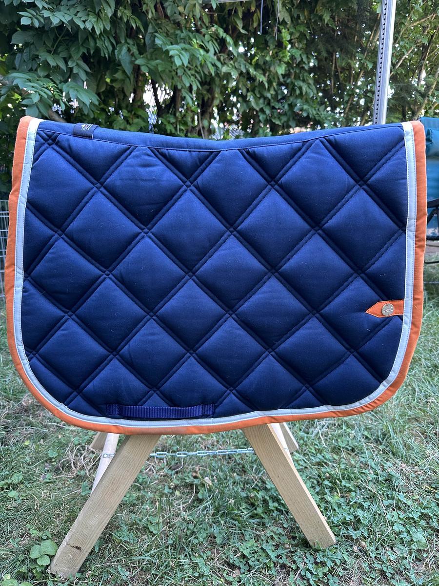 Tapis de selle de la marque Silver Crown en bleu marine, liserée blanc et bordure orange, taille mixte/CSO, en parfait état, très peu servi, petite trace au niveau du passage de selle.
