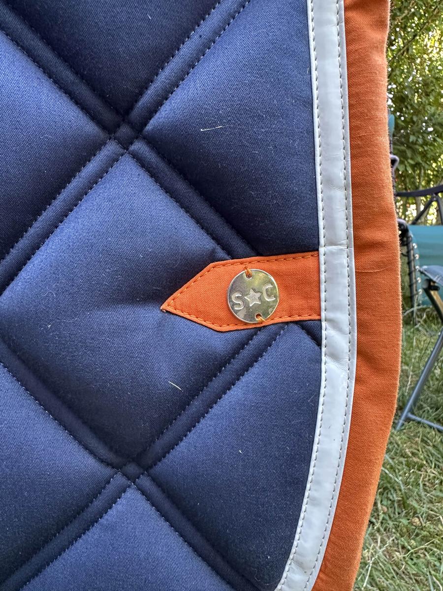 Tapis de selle de la marque Silver Crown en bleu marine, liserée blanc et bordure orange, taille mixte/CSO, en parfait état, très peu servi, petite trace au niveau du passage de selle.