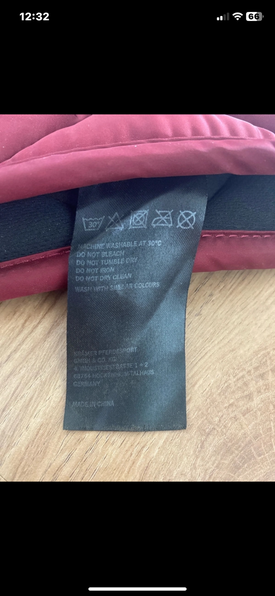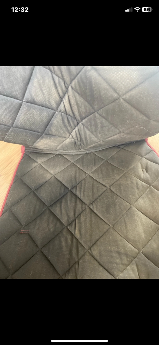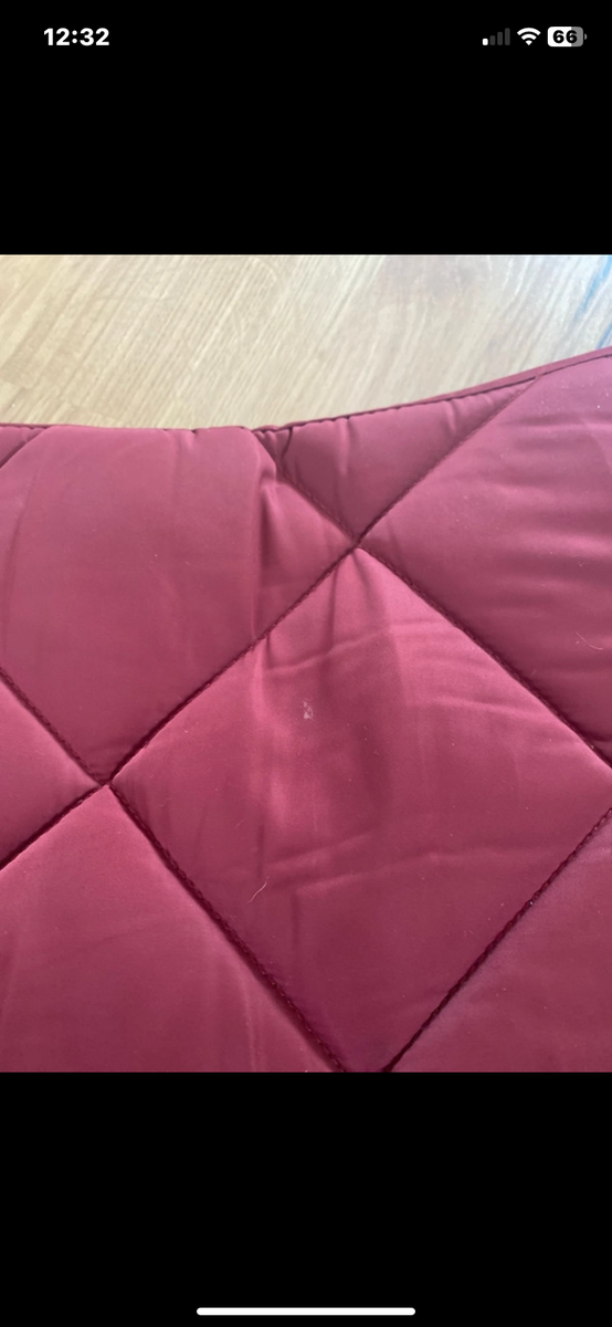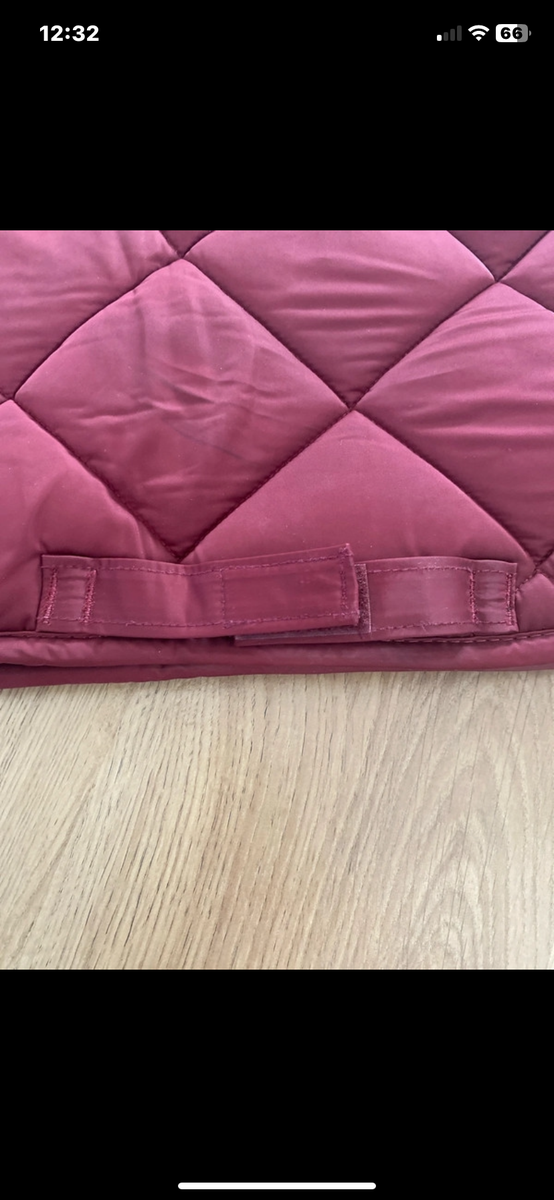 tapis d’equitation kramer felix buhler bordeaux parfait état porte 3 fois 1 petite tache de sable ( voir photo) ne se voit pas avec la selle et doit partir au lavage normalement je passerais un coup de brosse sur l’intérieur du tapis avant l’envoie achète 48€—> vendu 38€