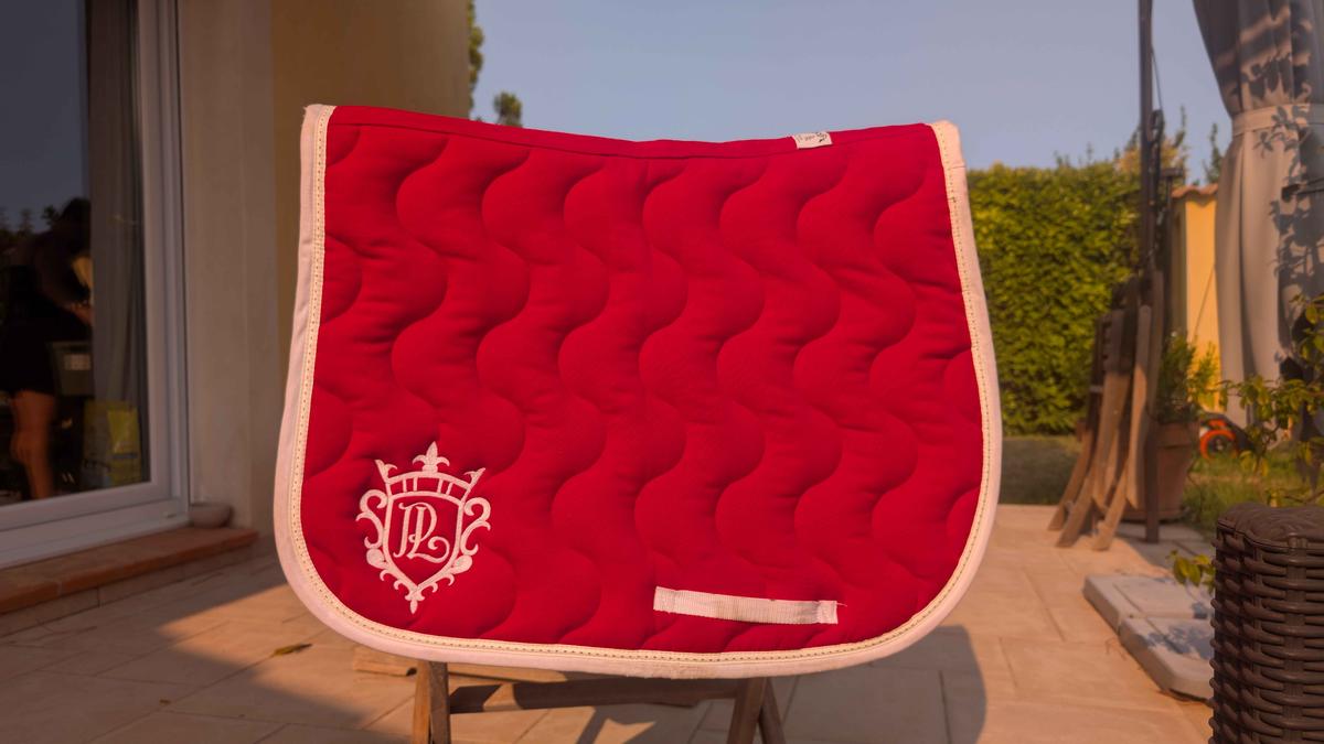 Tapis cheval Pénélope rouge blanc bonne état dans l'ensemble, une tâche jaune a l'intérieur du tapis et légèrement abîmé sur les passages de sangles.