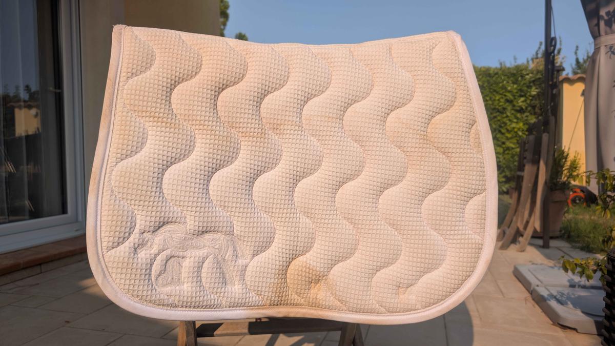 Tapis cheval Pénélope rouge blanc bonne état dans l'ensemble, une tâche jaune a l'intérieur du tapis et légèrement abîmé sur les passages de sangles.