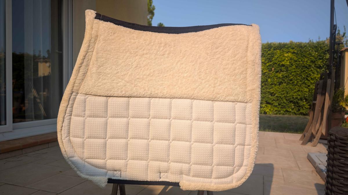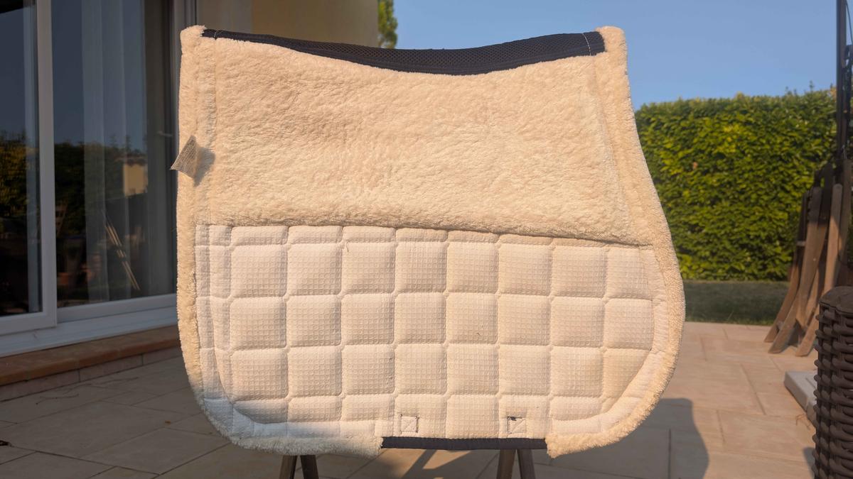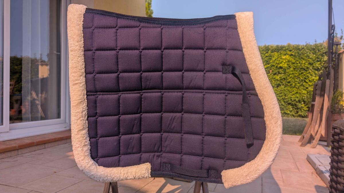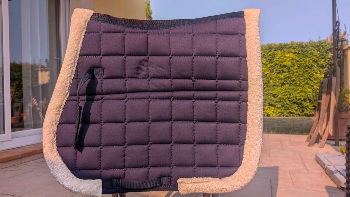 Tapis de dressage cheval, bleu blanc légèrement rembourser sous l'amortisseur. Très peu utilisé, et neuf sans étiquette de marque.