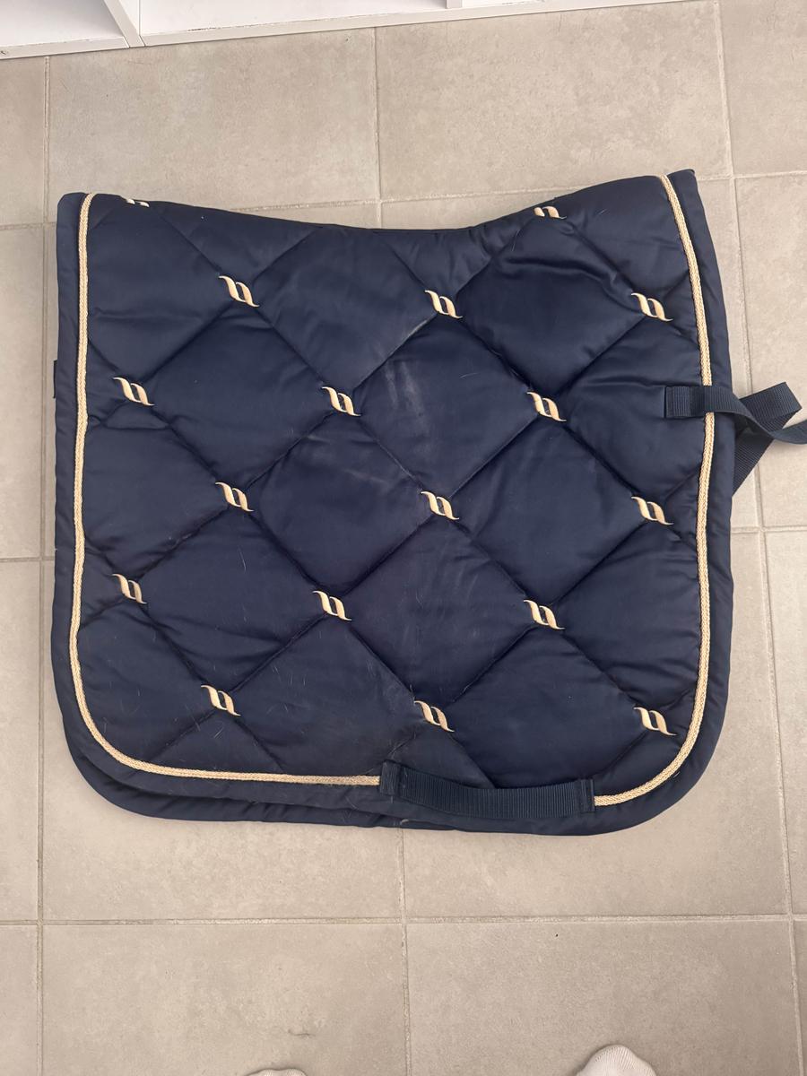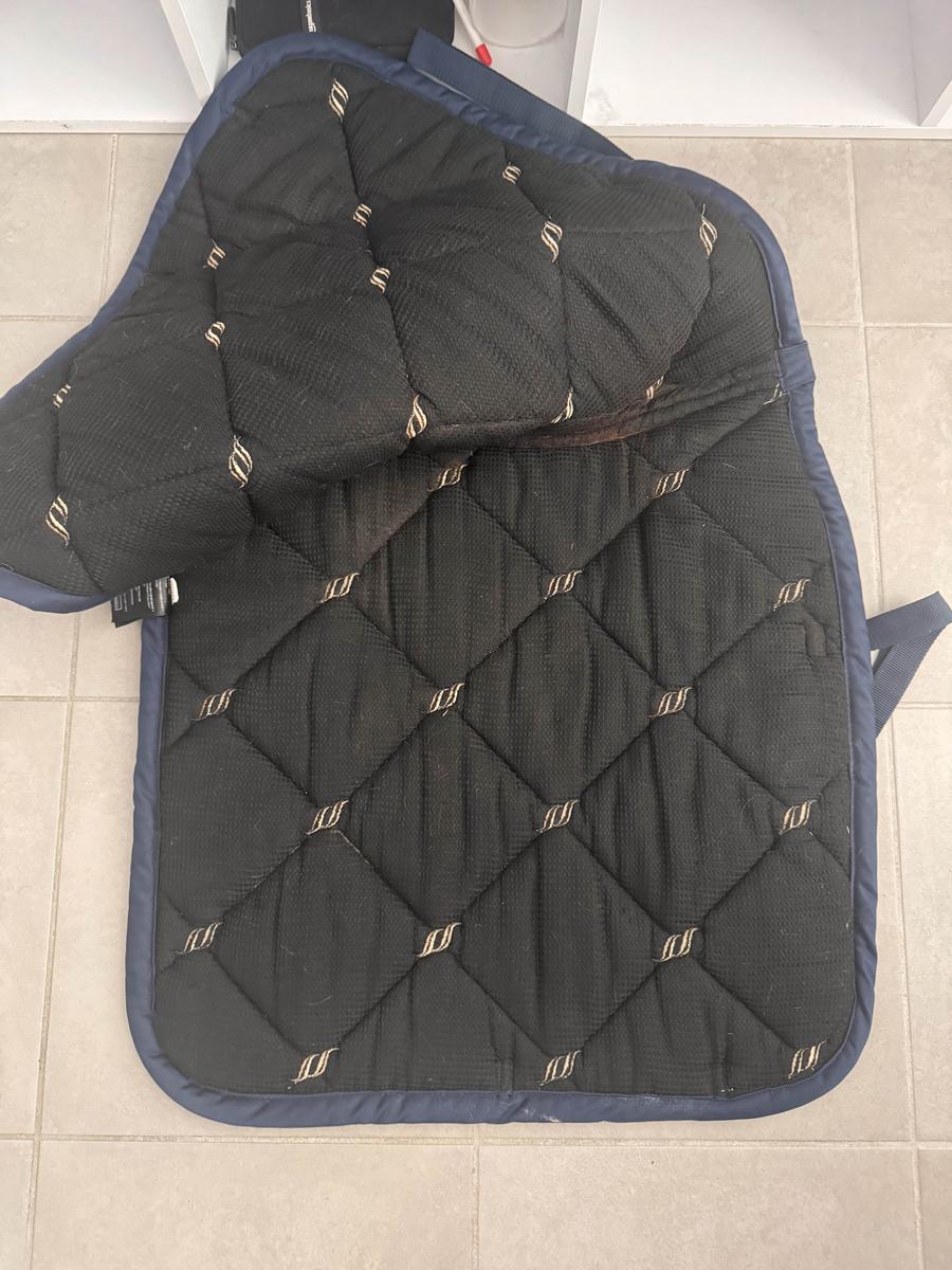 tapis back on track bleu marine coupe dressage, taille cheval, excellent état sauf des petites traces de sueur que j’arrive pas à faire partir à la machine à laver