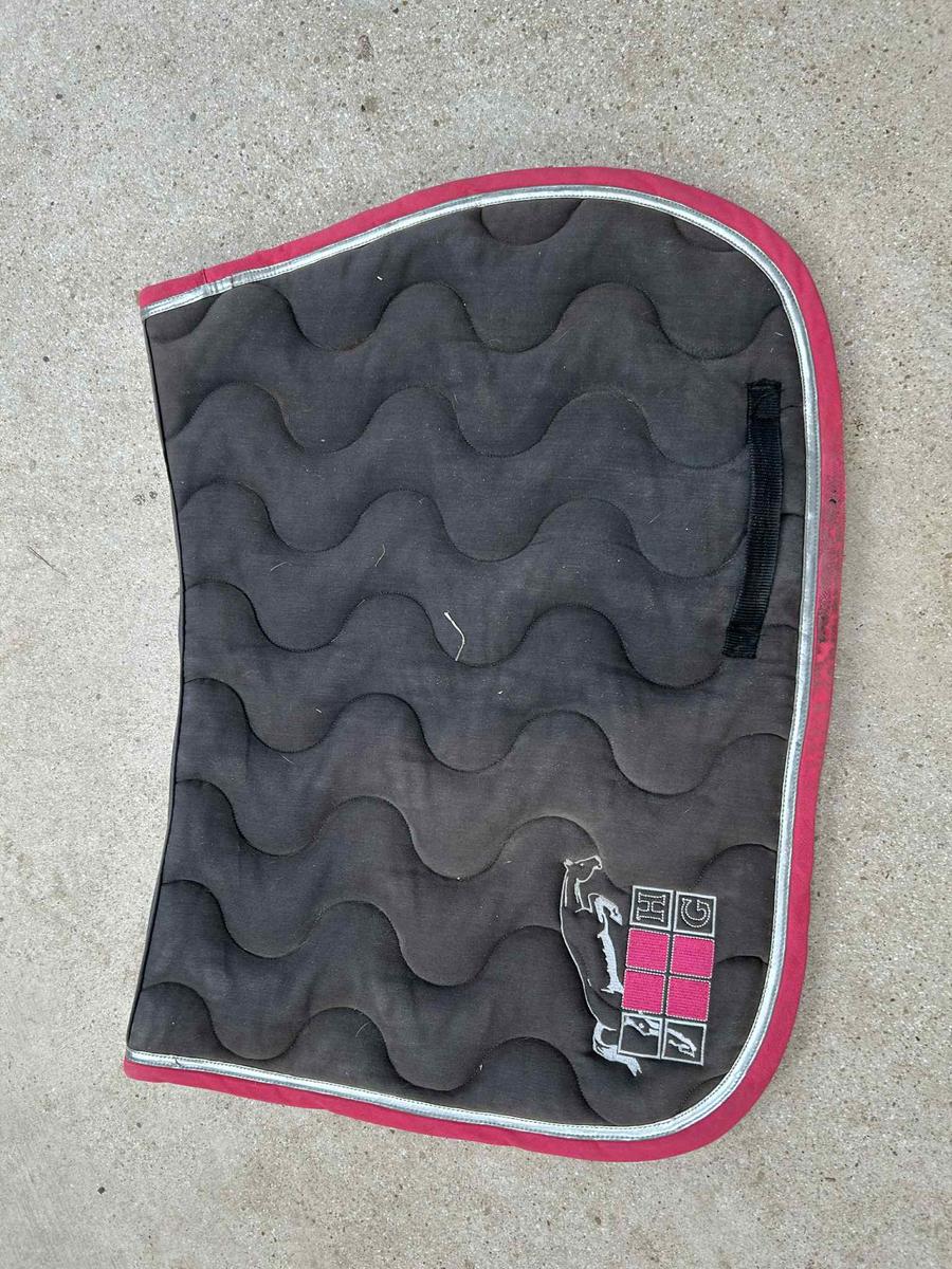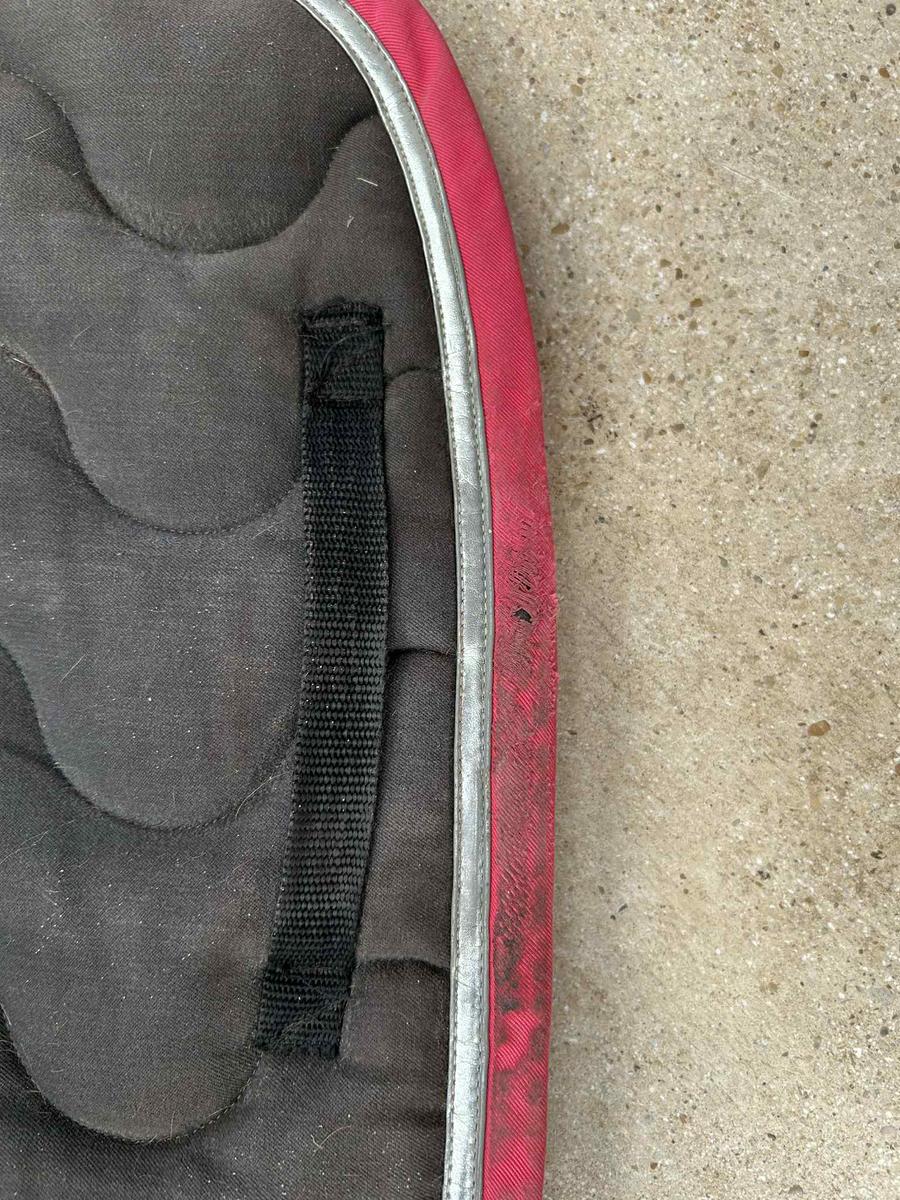 Tapis taille cheval Jump’in gris et fuschia avec liseré vernis argenté.