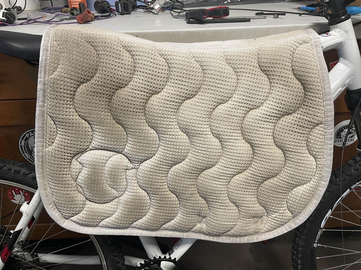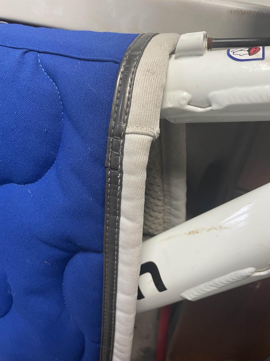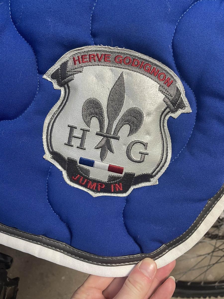Tapis mixte Hervé Godignon / Jumpin, ancienne collection avec la fleur de lys. Bleu roi avec bordure blanche et simili cuir gris, taille cheval. A été porté mais reste en très bon état, juste la bordure blanche un peu tachée surtout au passage de sangle Je vend un bonnet de la même couleur, n’hésitez pas à faire un lot 😊
