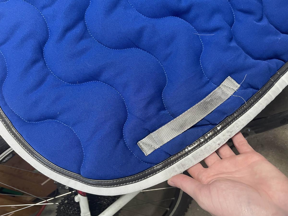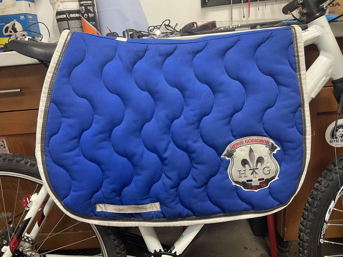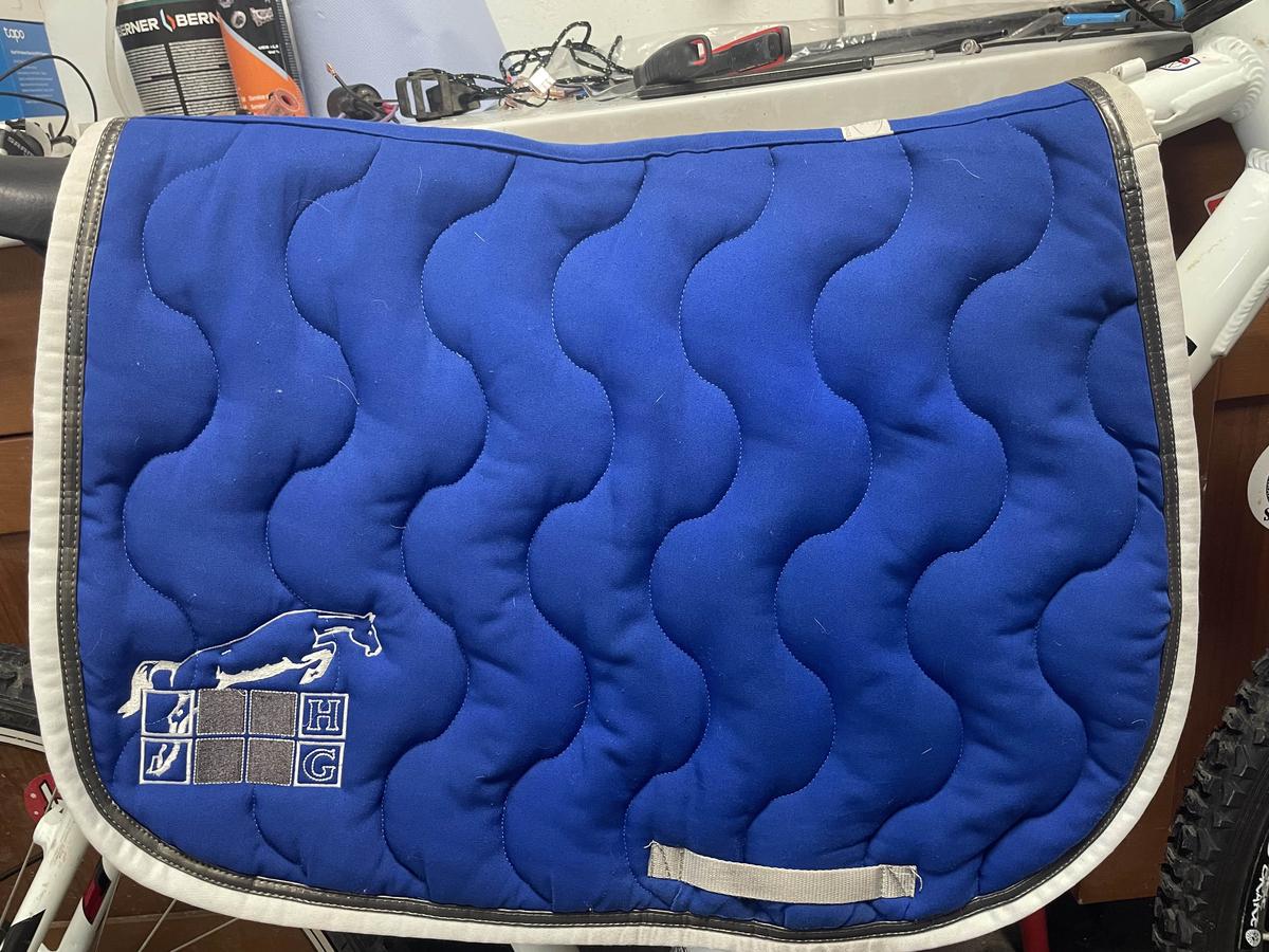 Bleu roi avec bordure blanche et simili cuir gris, taille cheval.