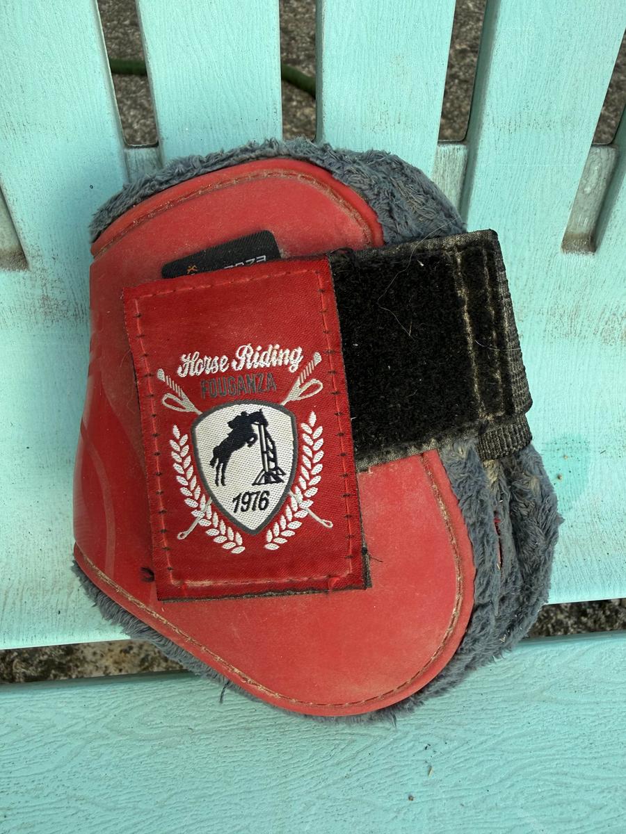 Lot comprenant : - Tapis rouge/gris/bleu marine - Licol rouge et bleu marine - Protège boulet taille cheval, rouge et gris Bon état Prix du lot : 20€