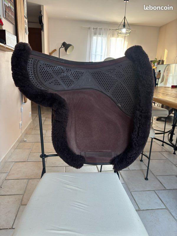 Tapis de selle en forme de selle avec faux mouton marron/marron né de la collaboration entre Lemieux et Acavallo . Face grip pouvant être mise en contact avec le dos ou la selle. Très bon état , porté deux fois . Convient pour selle mixte ou selle avec peu d’avancée de quartier. Utilisé avec Wintec 500 et lite sans problème . Sera nettoyé pour la vente .