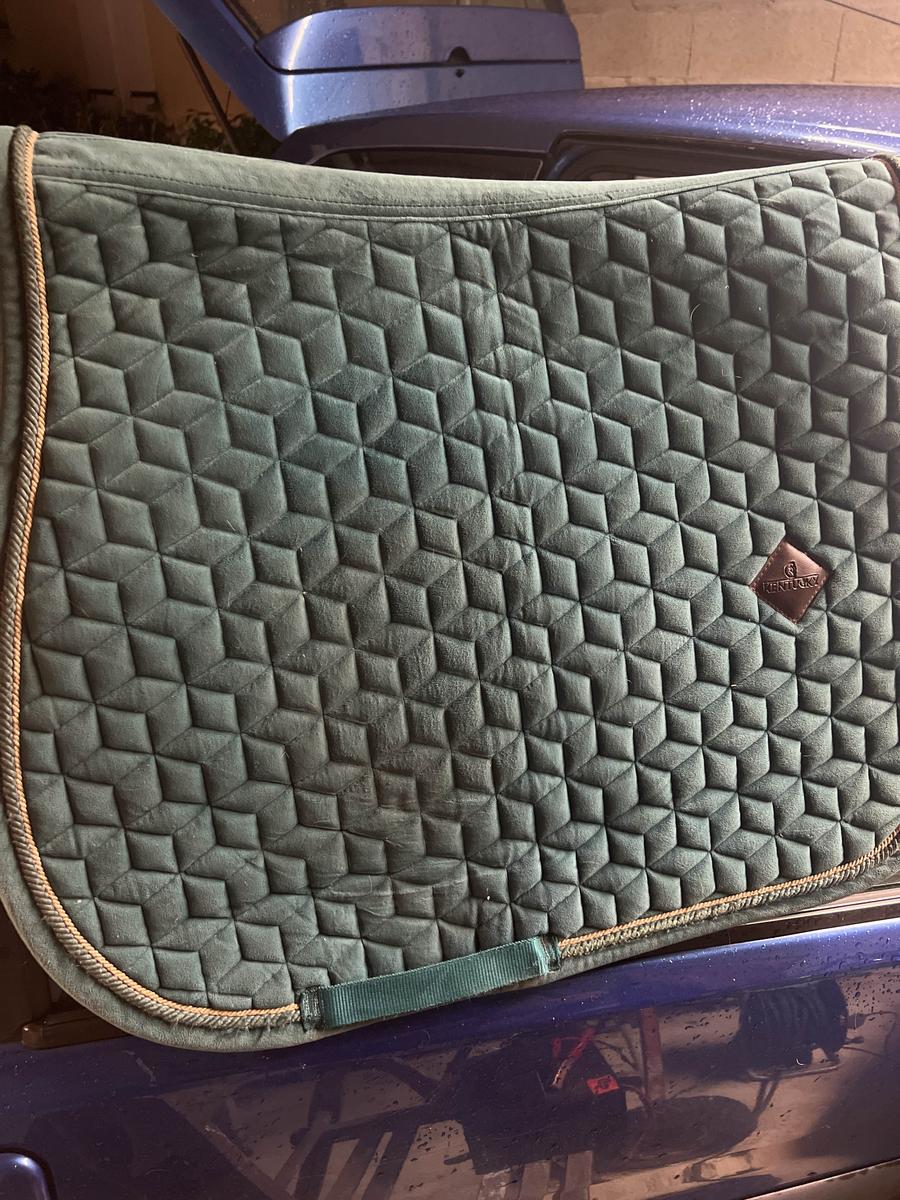 tapis velvet kentucky émeraude qui va sur des poneys comme sur des chevaux porté quelques fois quelques fils sorti au niveau du tour du tapis et au passage de sangle sinon le reste en très bon état