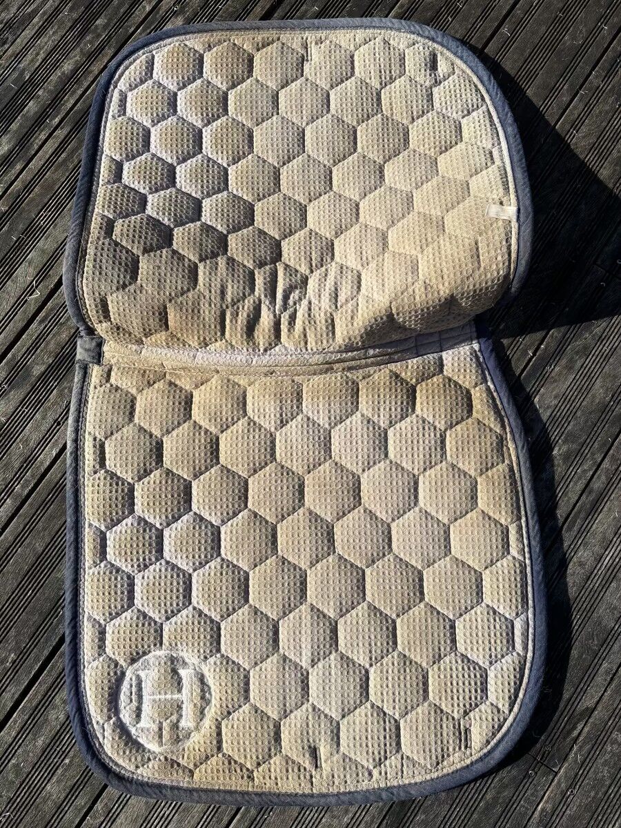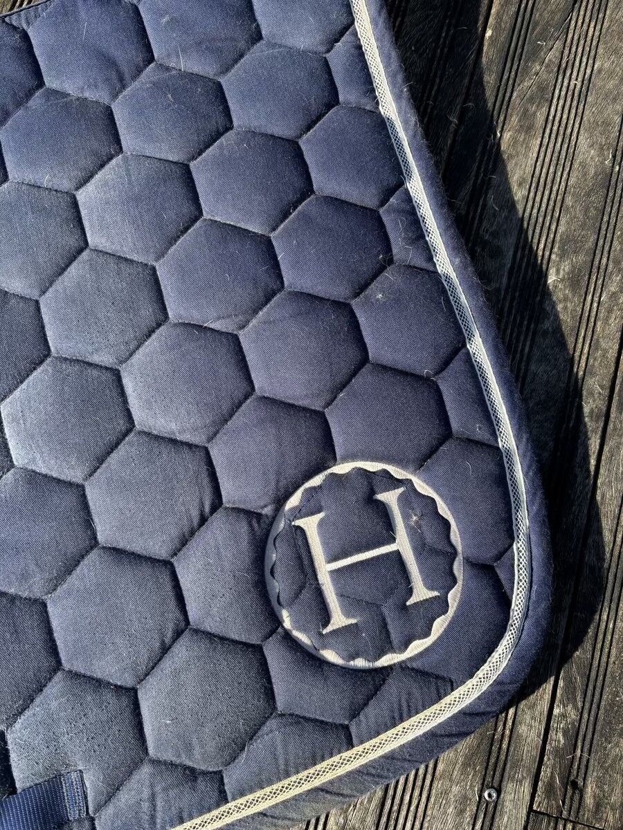 Tapis de dressage Harcour, bleu marine Taille Cheval Très bon état, une légère marque d’usure au passage de sangle (voir photos) mais rien de flagrant.
