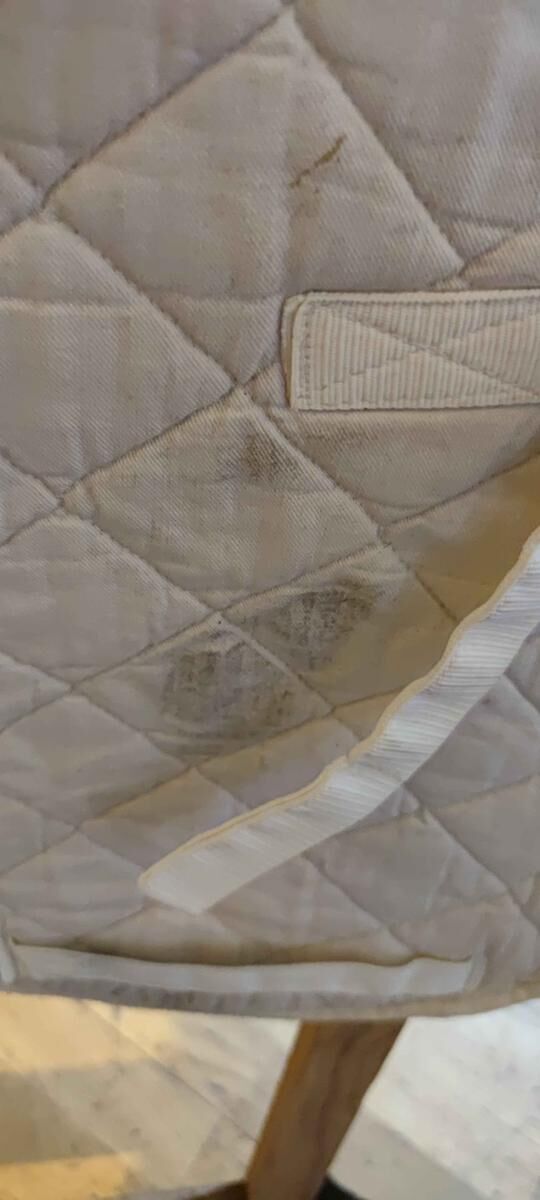 tapis de selle blanc, de marque Decathlon, en bon état d'usage avec des traces d'utilisation visibles