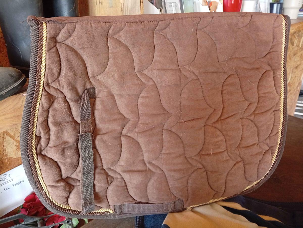 liseré or/marron. pas de taches . très légères traces d'usure au niveau du liseré. pas de trou. vendu lavé . intérieur beige