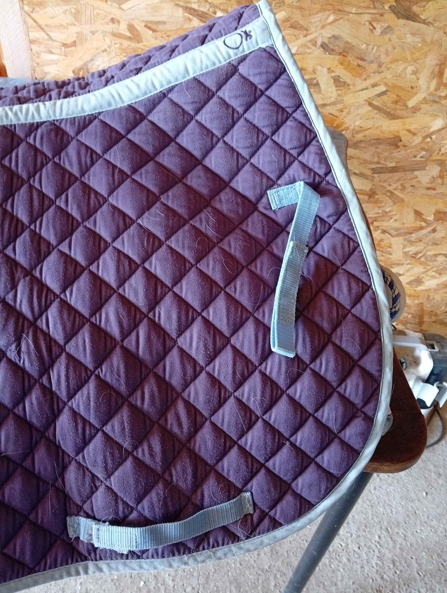 tapis violet avec bordures bleu ciel légèrement délavé. pas d'accroc pas de trou pas de tâches. vendu lavé