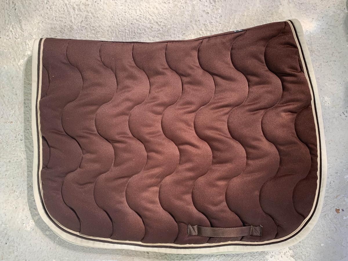 Tapis Paddock Sport marron bordure beige. Brodé « Sellerie André Faure ». Très bon état, peu utilisé. Taille cheval.
