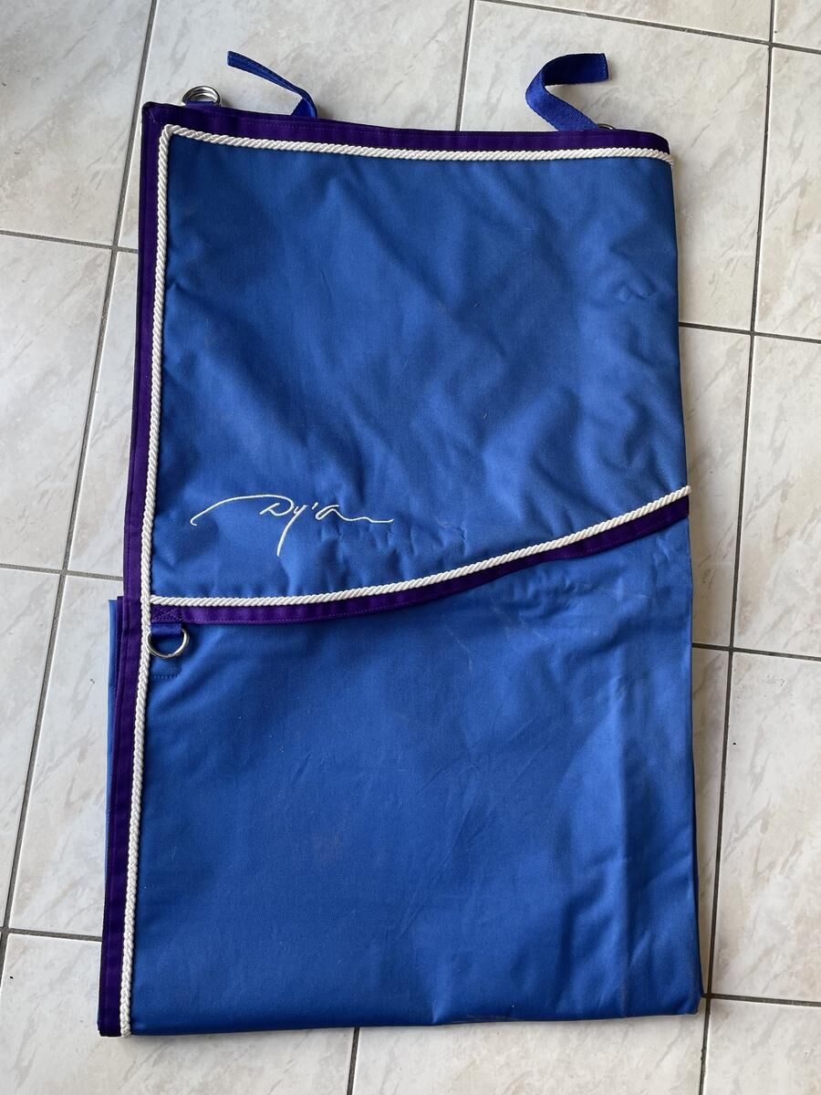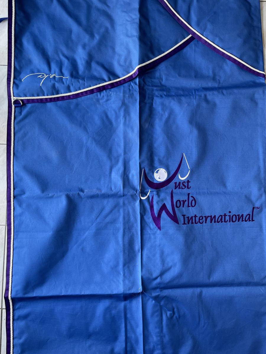 Tenture de box Dyon bleu roi avec liserés violet et blanc, en collaboration avec just word international.