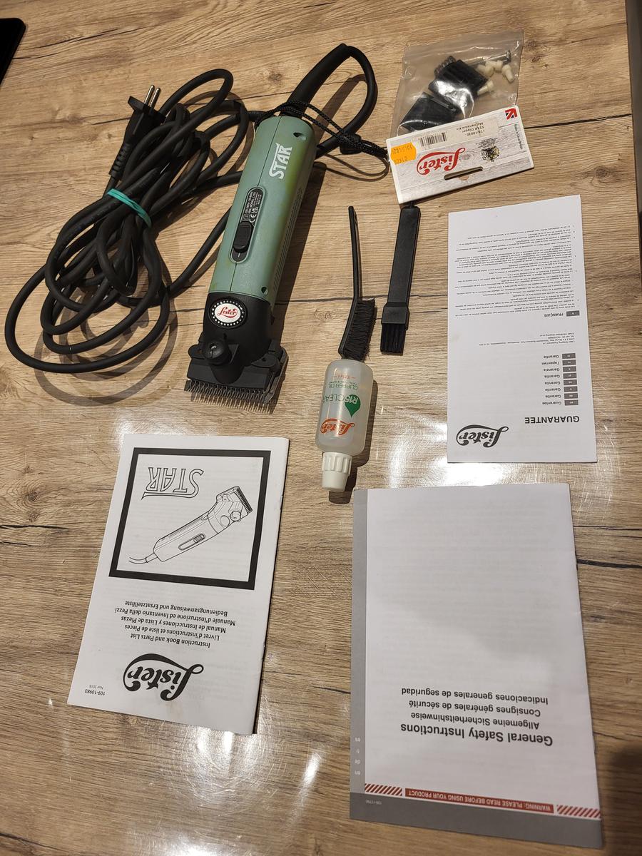 Vendue avec les peignes qui viennent d'être affûtés (Valeur affûtage : 25 €) et un kit de pièces de maintenance (21 € ; utilisé pour un bouton de serrage égaré), petit flacon d'huile Lister, 2 petites brosses.