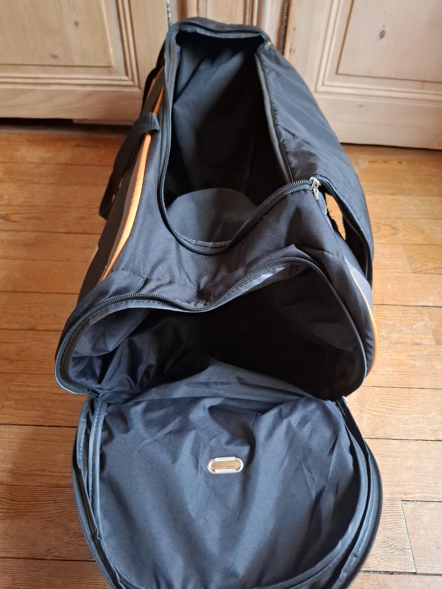 Valise de compétition/transport sur roulette. Imperméable, avec deux grandes poches de rangement (casque et bottes), et trois poches intérieures. Peut contenir briderie, tapis et amortisseur, guêtres... Utilisé que quelque fois.