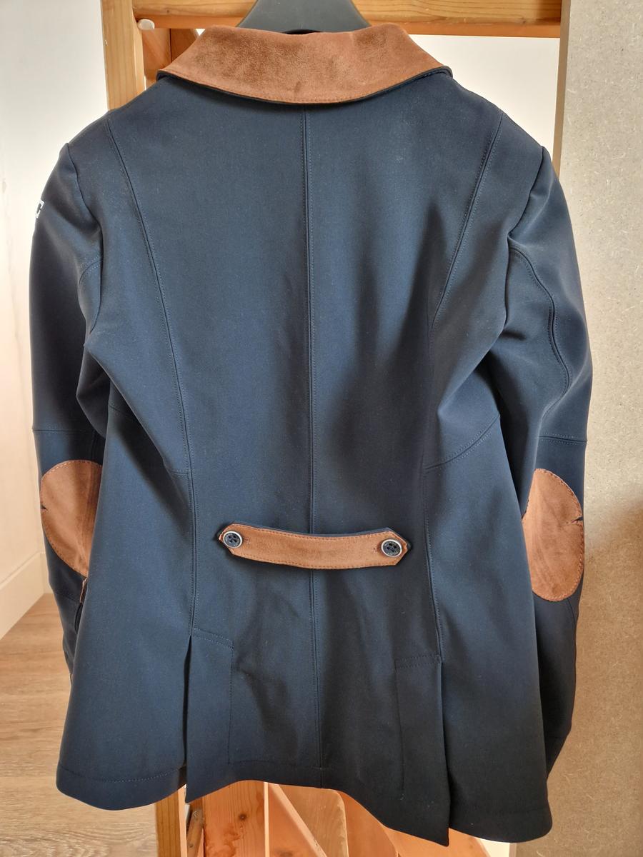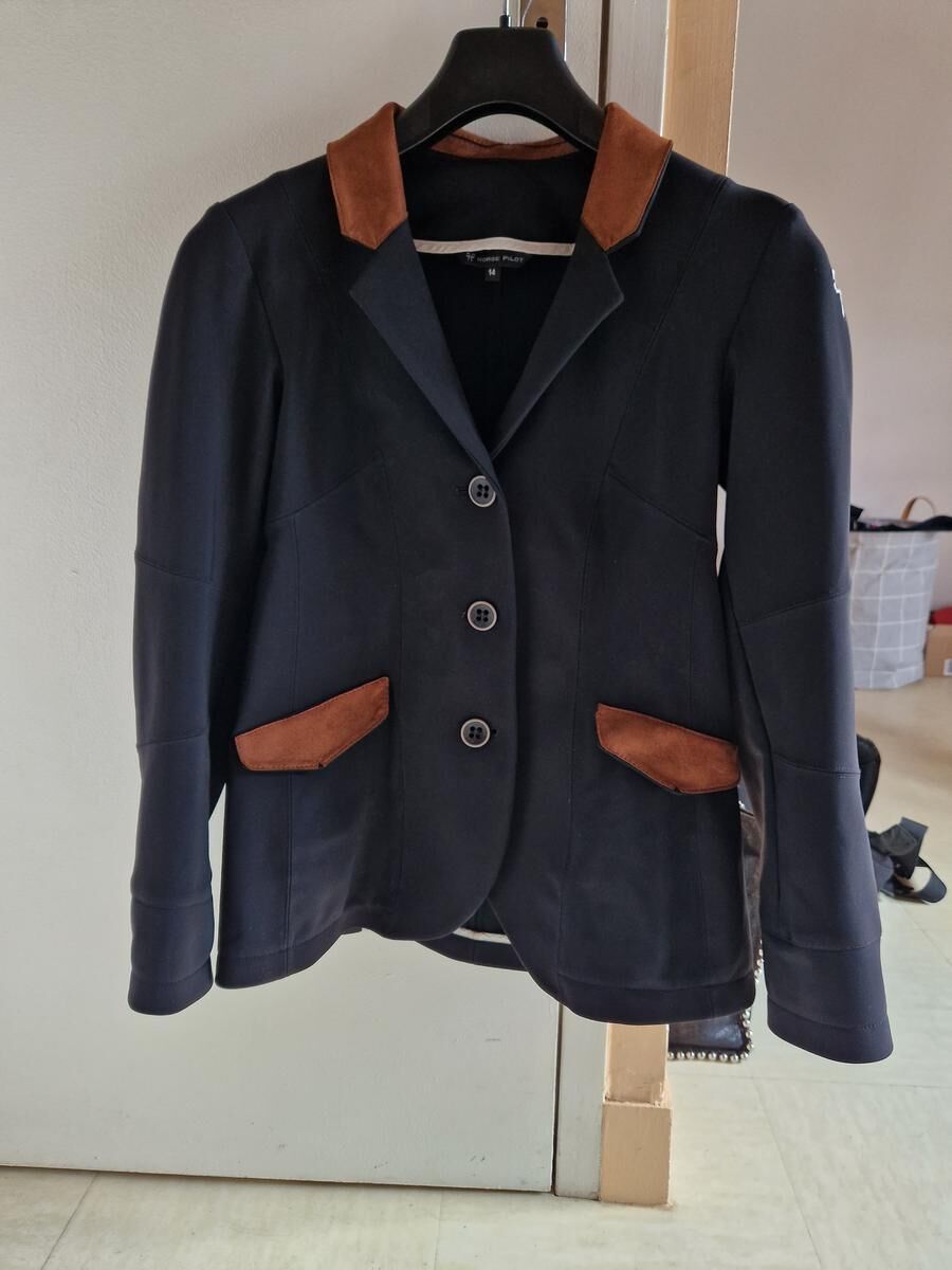 Veste de concours de la marque Horse Pilot. Couleur noire avec empiècements marrons. Collection enfant, taille 14 ans mais peut convenir pour un XS.